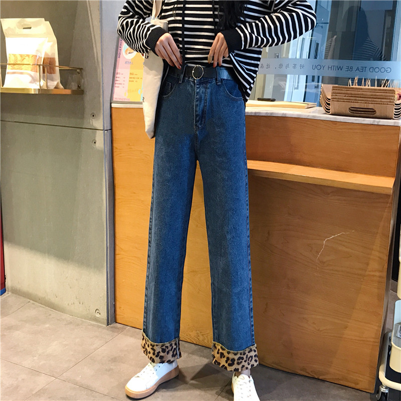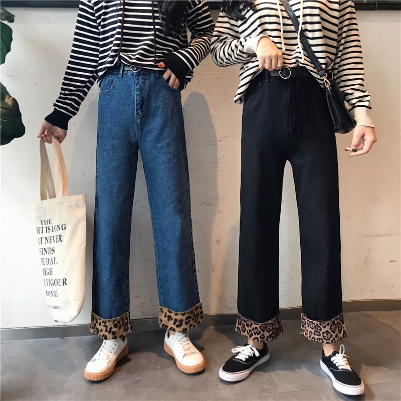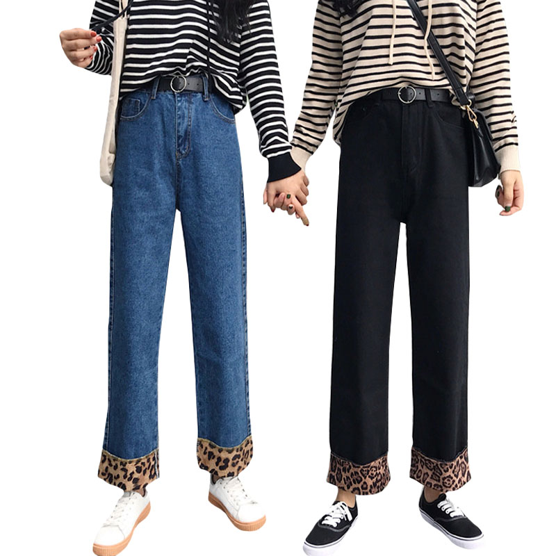/ 秋冬韓版豹紋拼接牛仔褲寬松顯瘦高腰直筒褲九分褲闊腿褲女士褲子