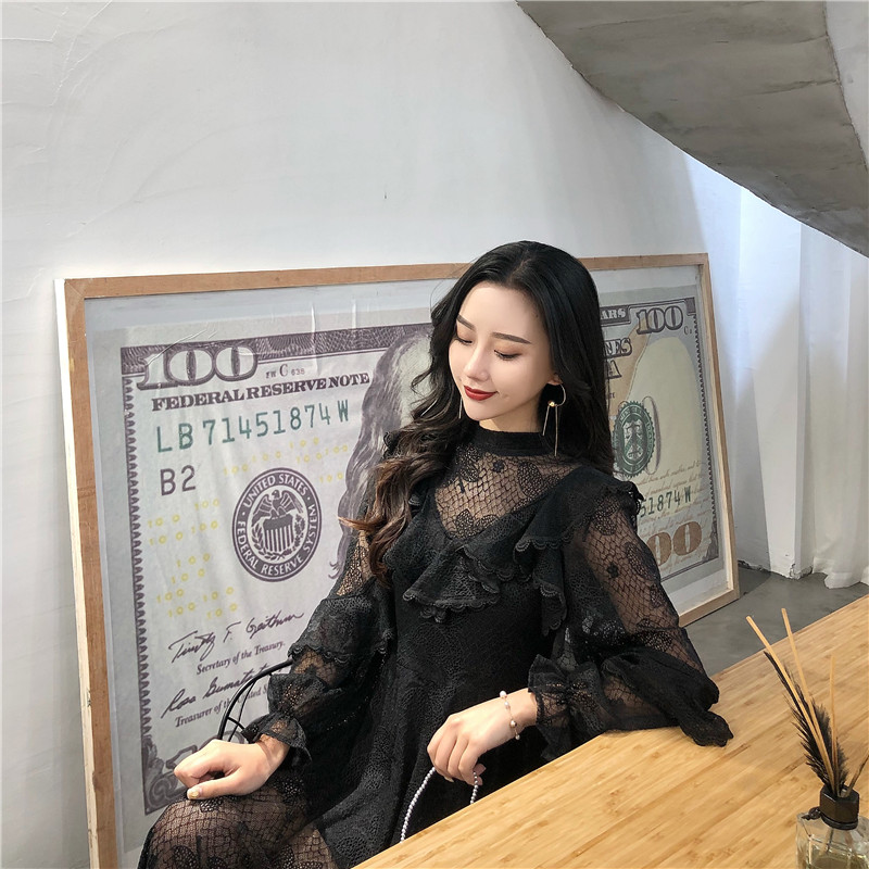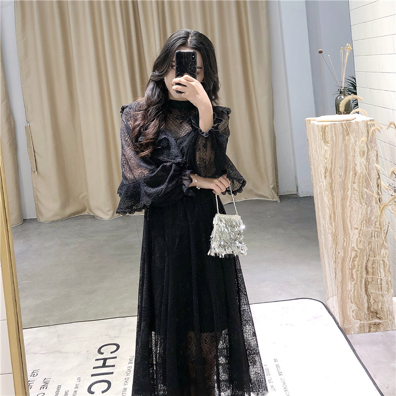 / 2018新款繡花小仙女氣質中長款蕾絲+吊帶連衣裙時尚套裝女兩件套