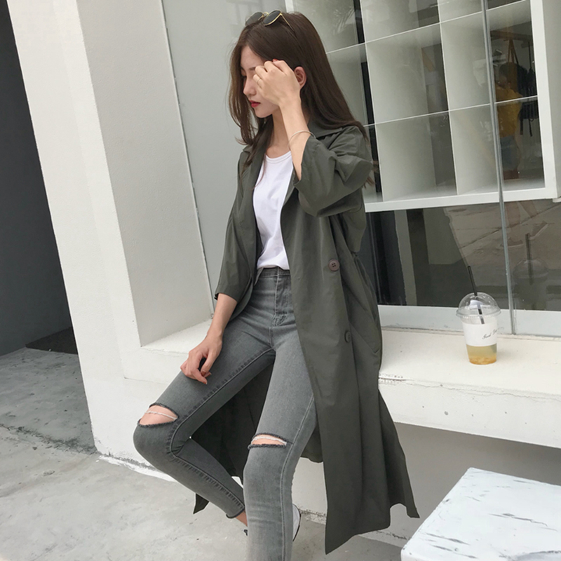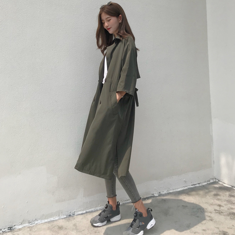 / 春秋新款女裝韓版寬松顯瘦系帶七分袖中長款過膝風衣外套女開衫潮