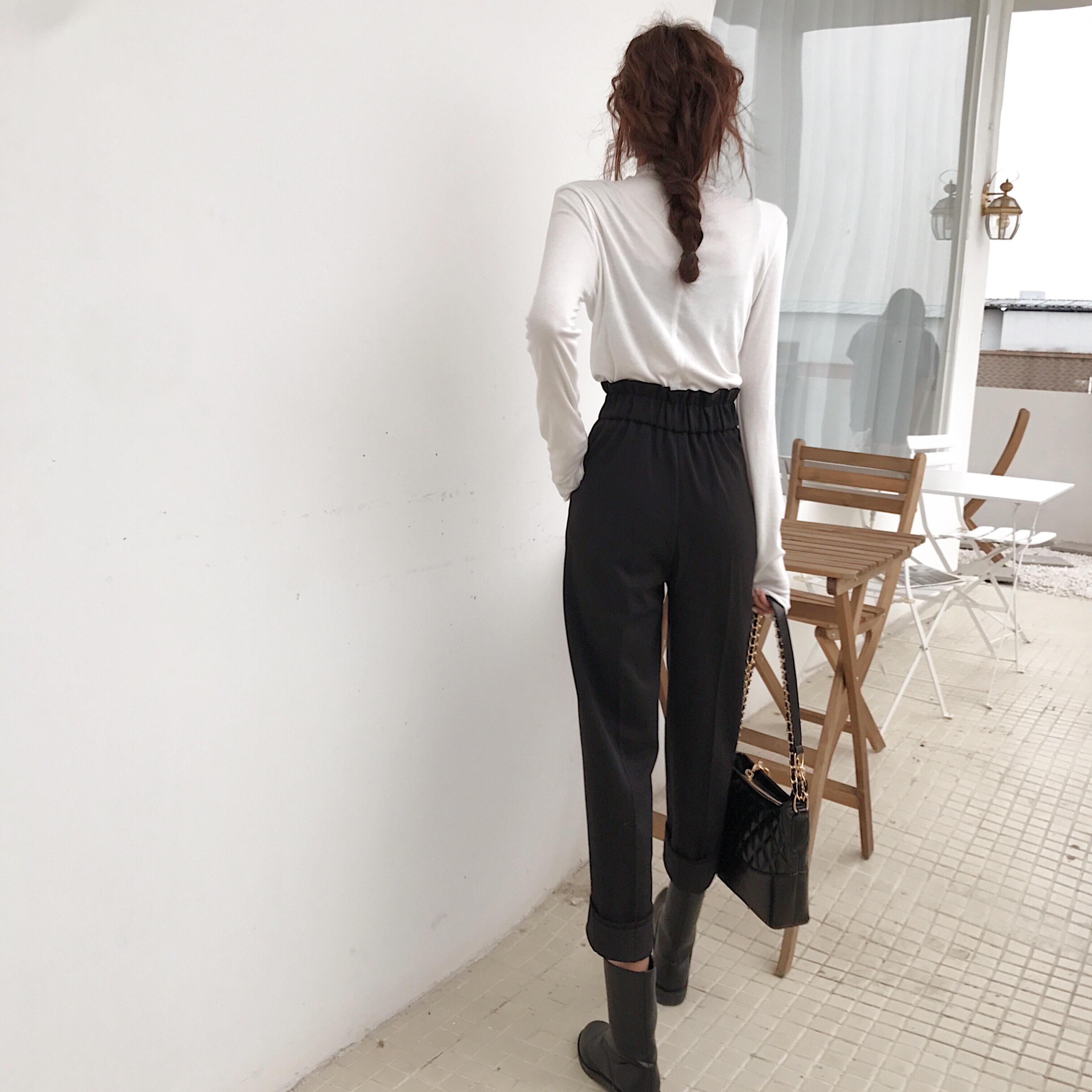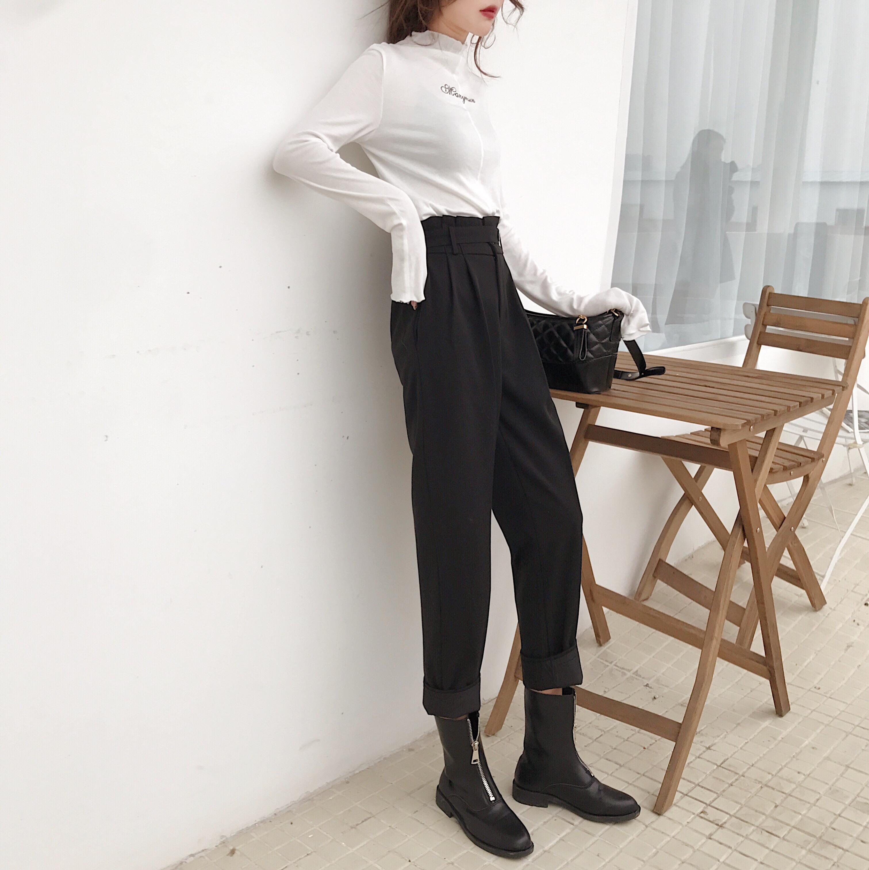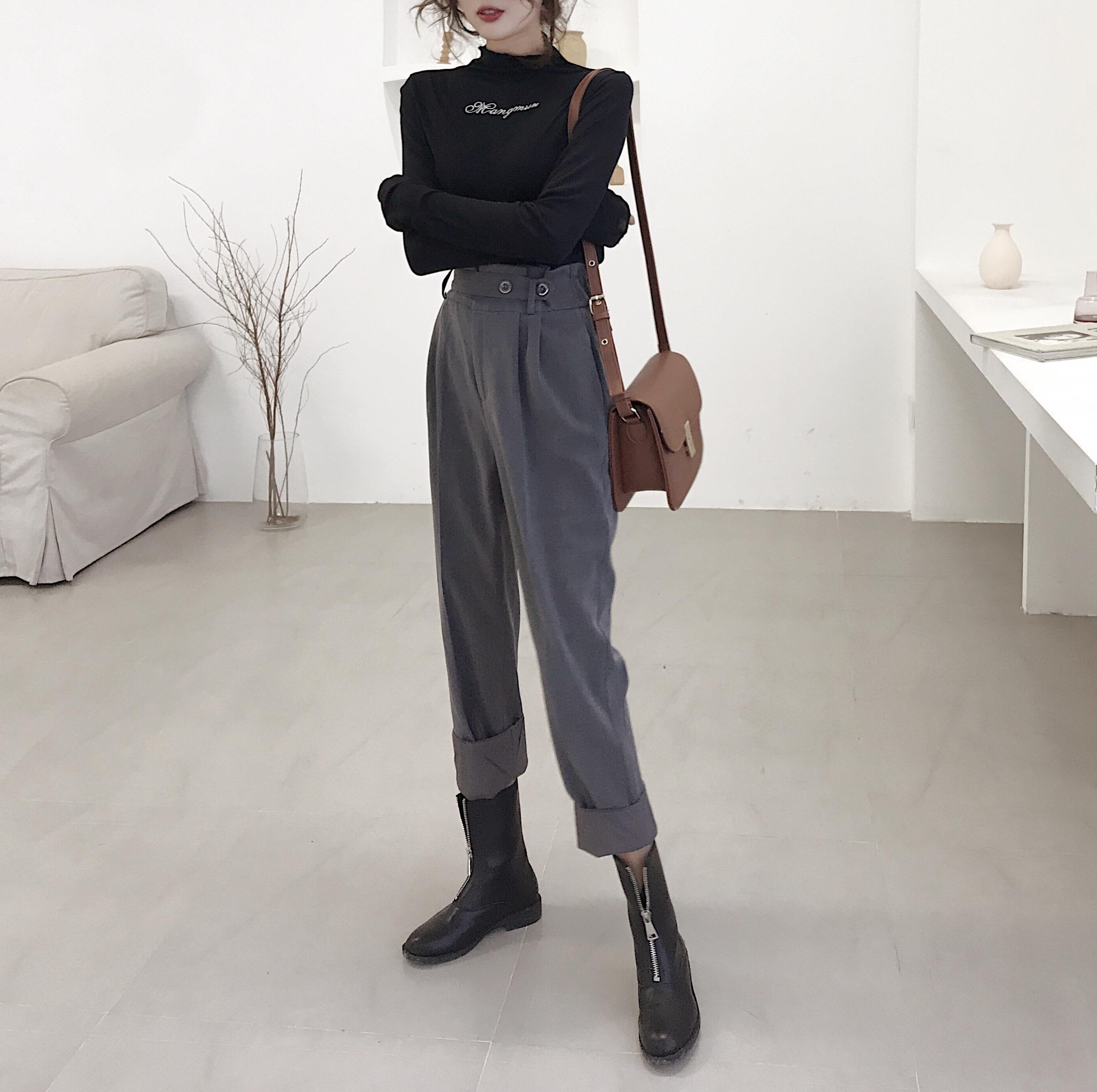 秋冬新款時尚套裝韓版半高領刺繡長袖打底衫高腰闊腿哈倫褲兩件套
