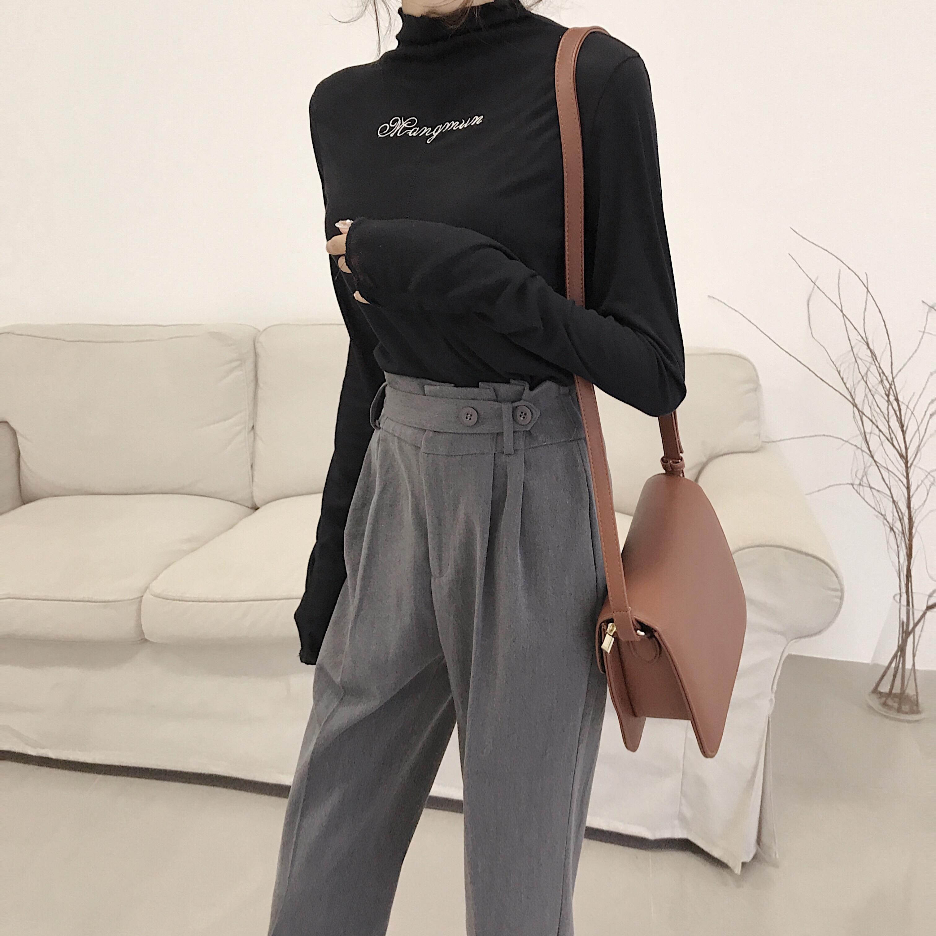 / 秋冬新款時尚套裝韓版半高領刺繡長袖打底衫高腰闊腿哈倫褲兩件套