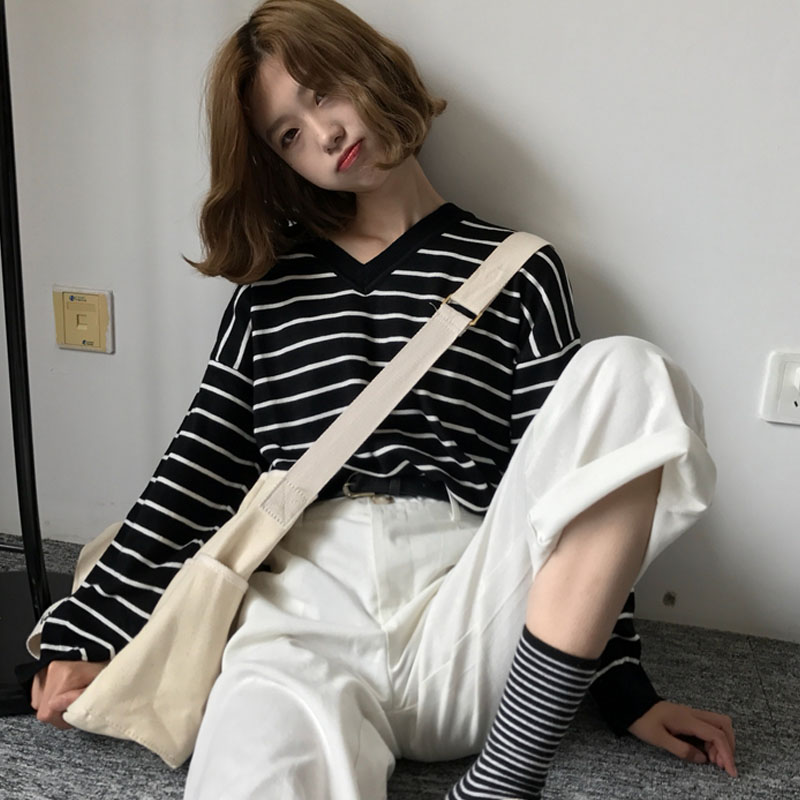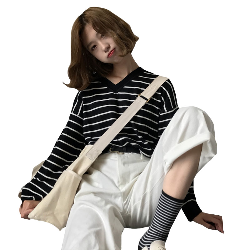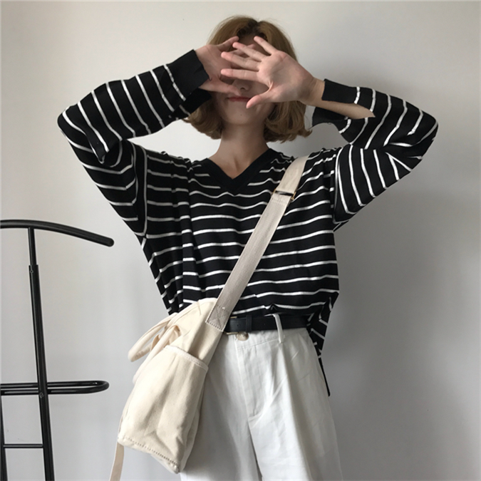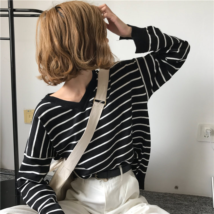 / 秋裝女裝韓版學院風寬松條紋針織衫開叉長袖套頭顯瘦T恤上衣學生