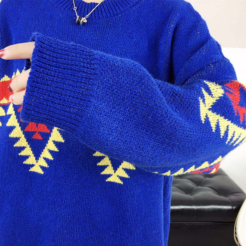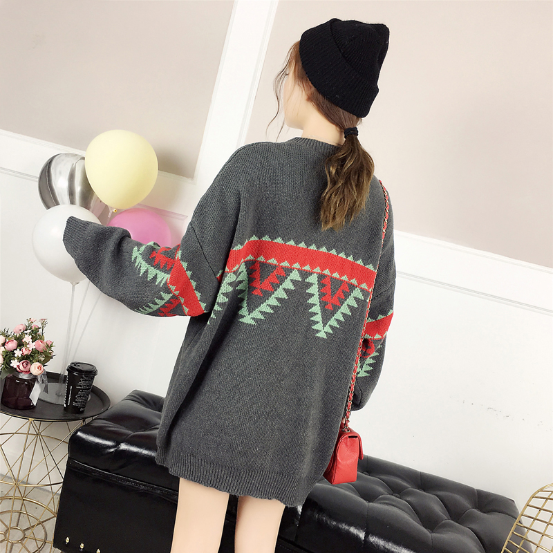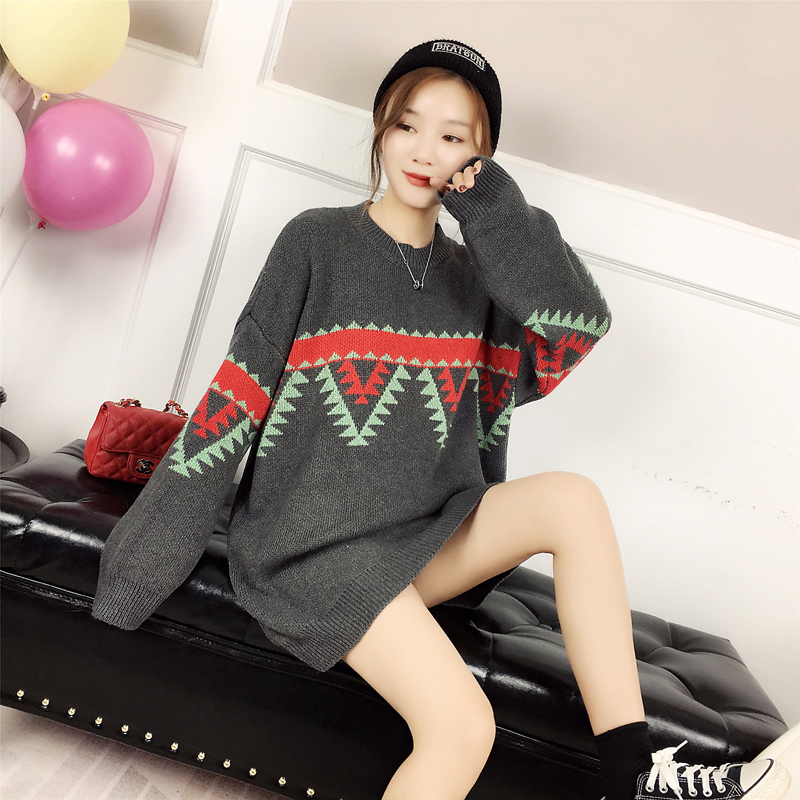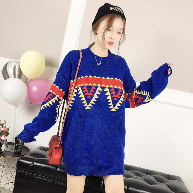 慵懶風中長款毛衣外套女冬裝2018新款韓版學生寬松撞色套頭針織衫