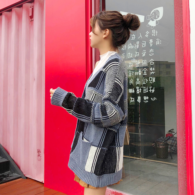 / 秋冬2018新款長袖寬松加厚格子毛衣開衫學生時尚女裝中長外套上衣