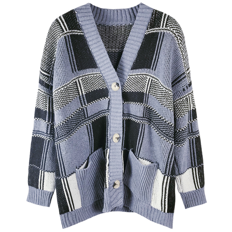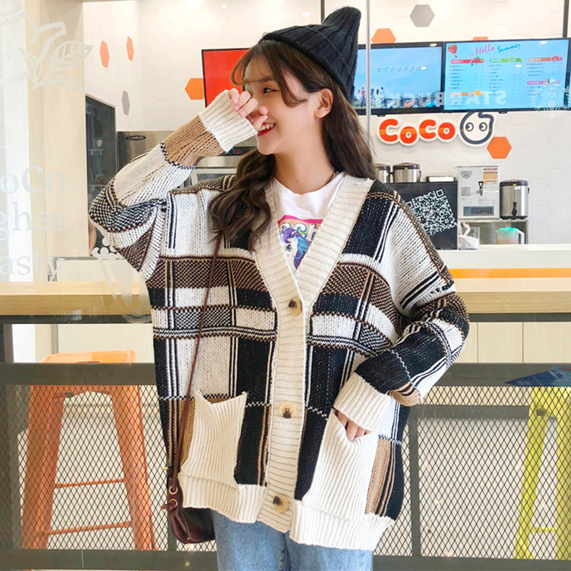 秋冬2018新款長袖寬松加厚格子毛衣開衫學生時尚女裝中長外套上衣