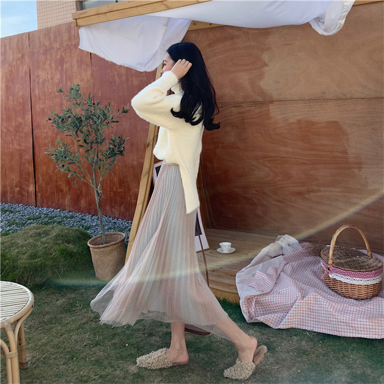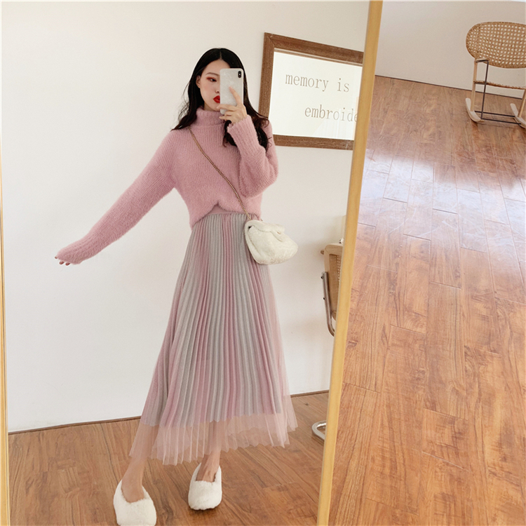 2018秋冬新款高領粗毛線寬松套頭毛衣中長款百搭百褶裙時尚套裝女