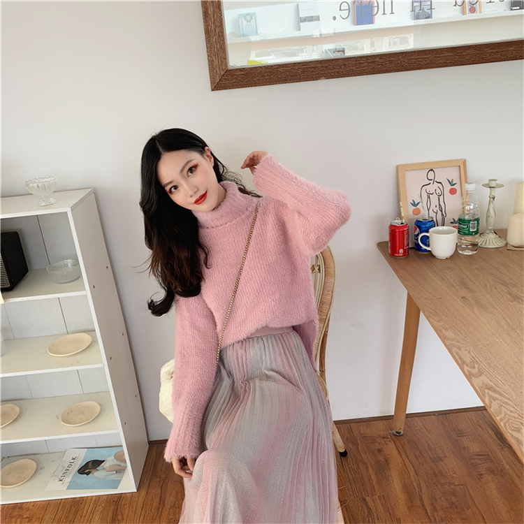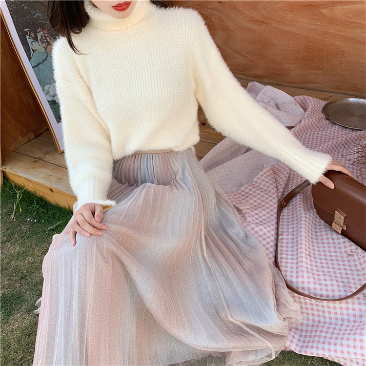 / 2018秋冬新款高領粗毛線寬松套頭毛衣中長款百搭百褶裙時尚套裝女