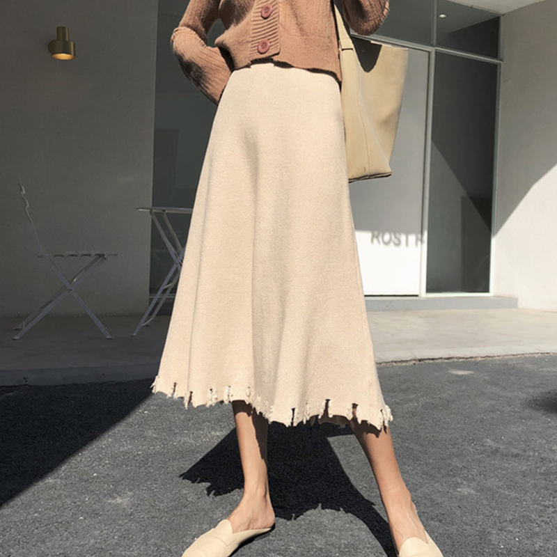 / 秋季女裝2018新款韓版chic半身裙高腰針織中長裙學生毛邊A字裙子