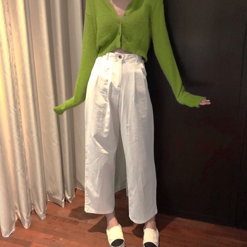 / 秋季套裝女時尚兩件套港味草綠色短款針織開衫+高腰寬松闊腿褲子