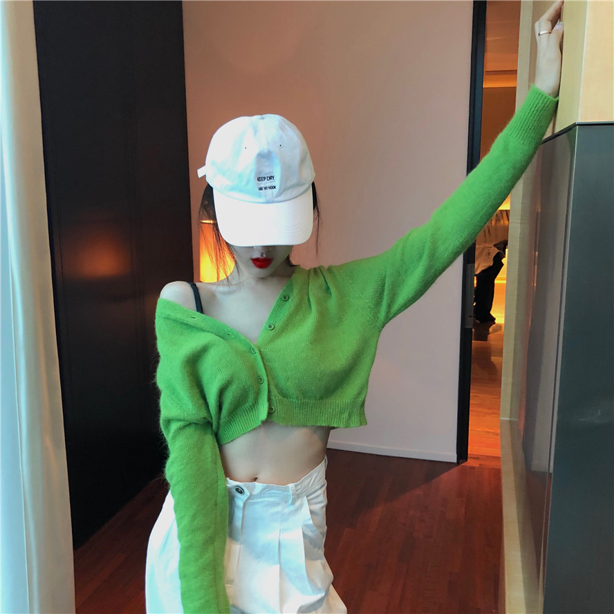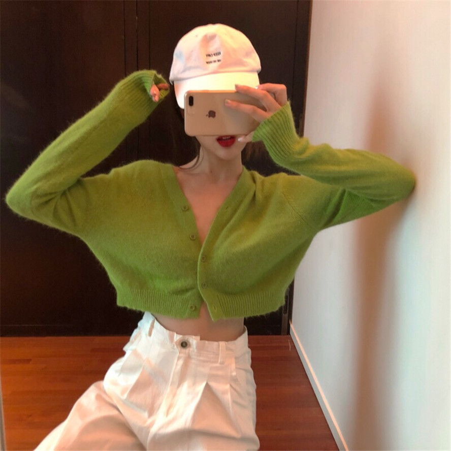 韓版chic早秋慵懶溫柔毛衣坑條V領一排扣喇叭袖純色百搭針織開衫