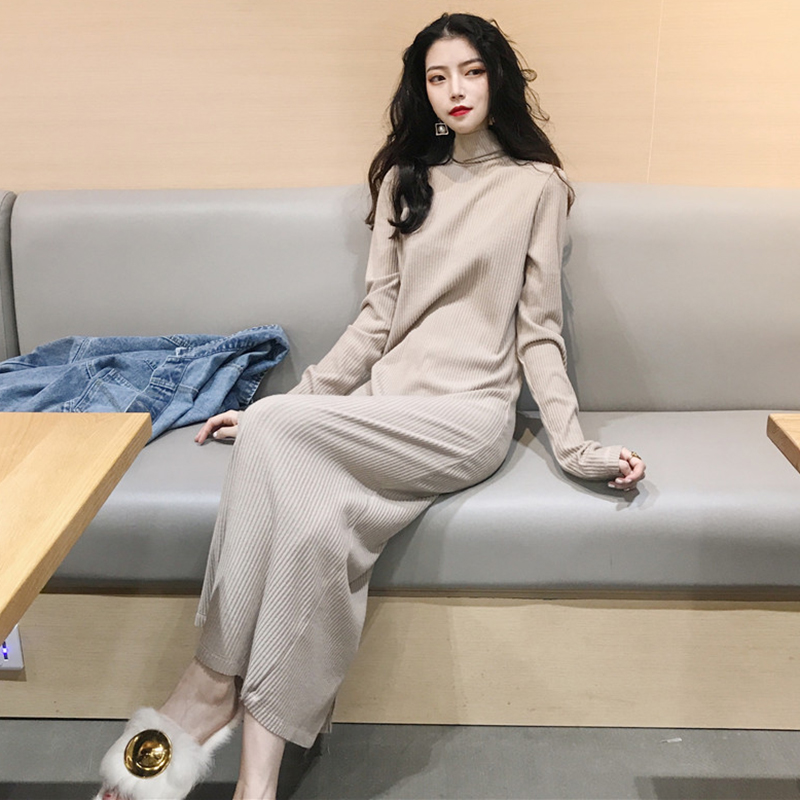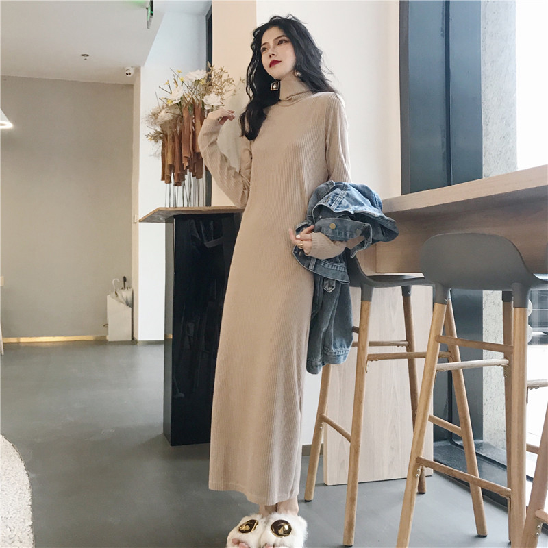 / 長款后開叉裙子女秋冬裝2018新款韓版寬松顯瘦高領長袖打底連衣裙