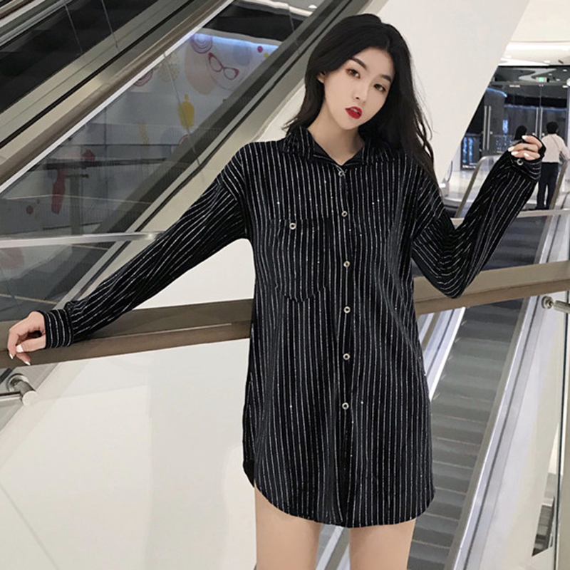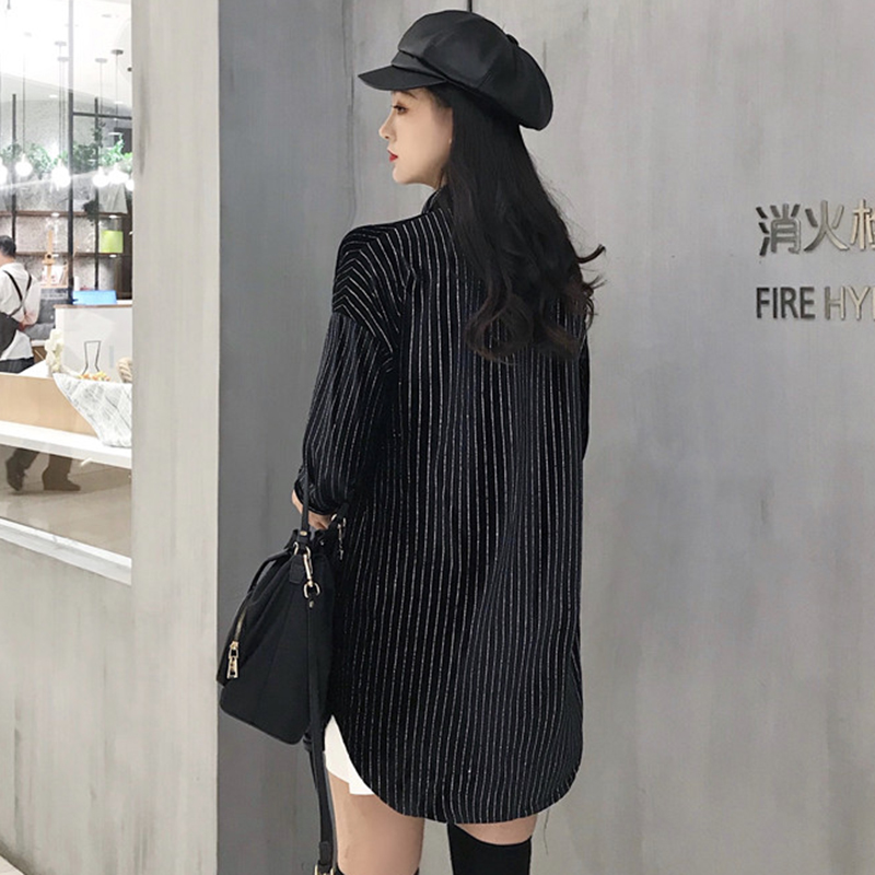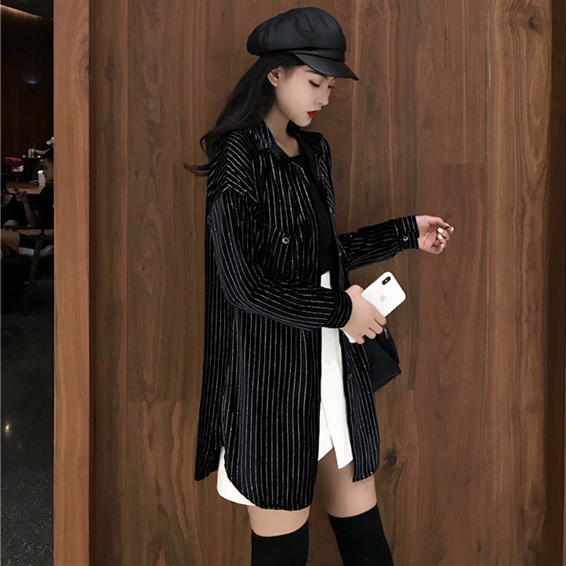 / 絲絨條紋軟妹長袖襯衫女秋冬裝新款冷系中長款外套港味黑色上衣潮