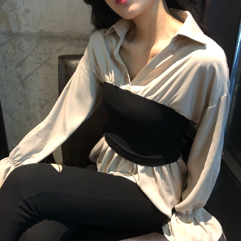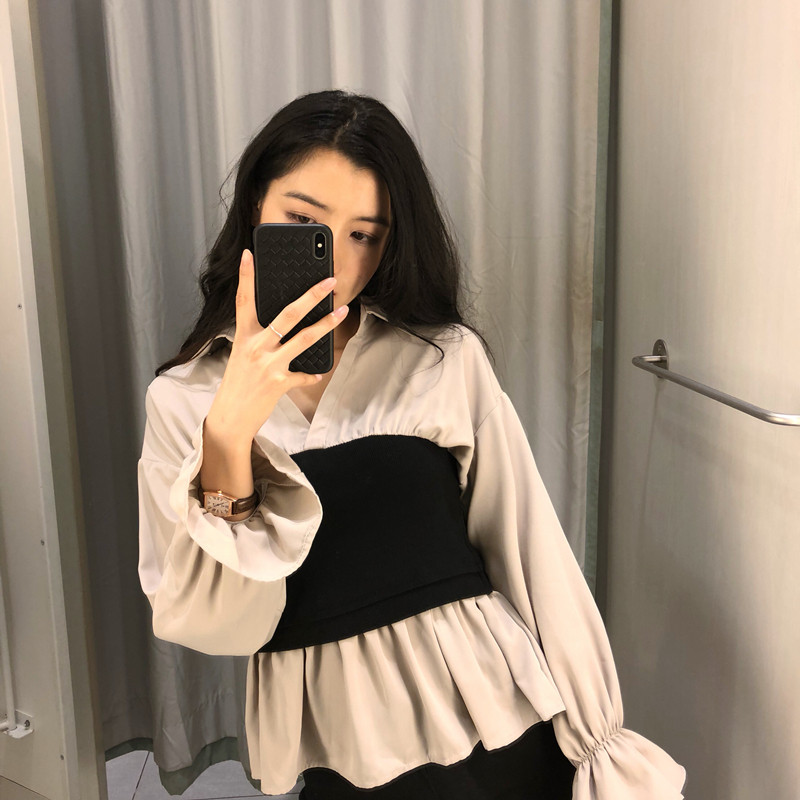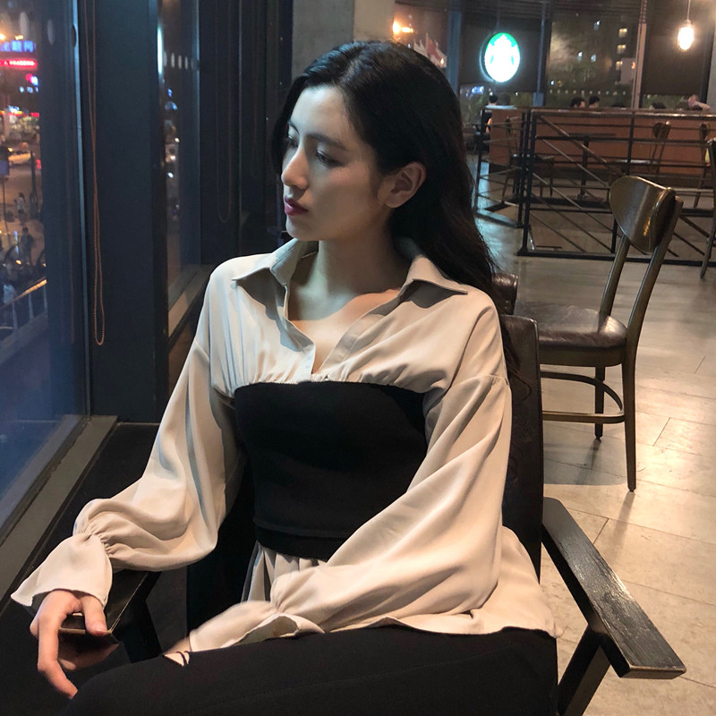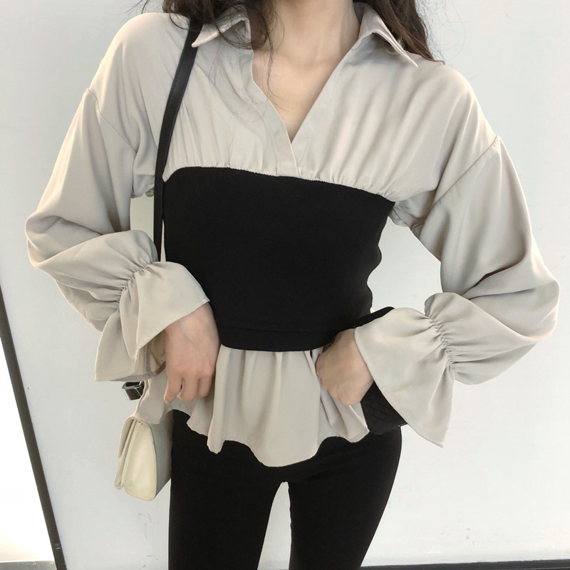 / 秋裝新款復古chic拼接收腰V領甜美溫柔百搭港風時尚洋氣襯衫上衣