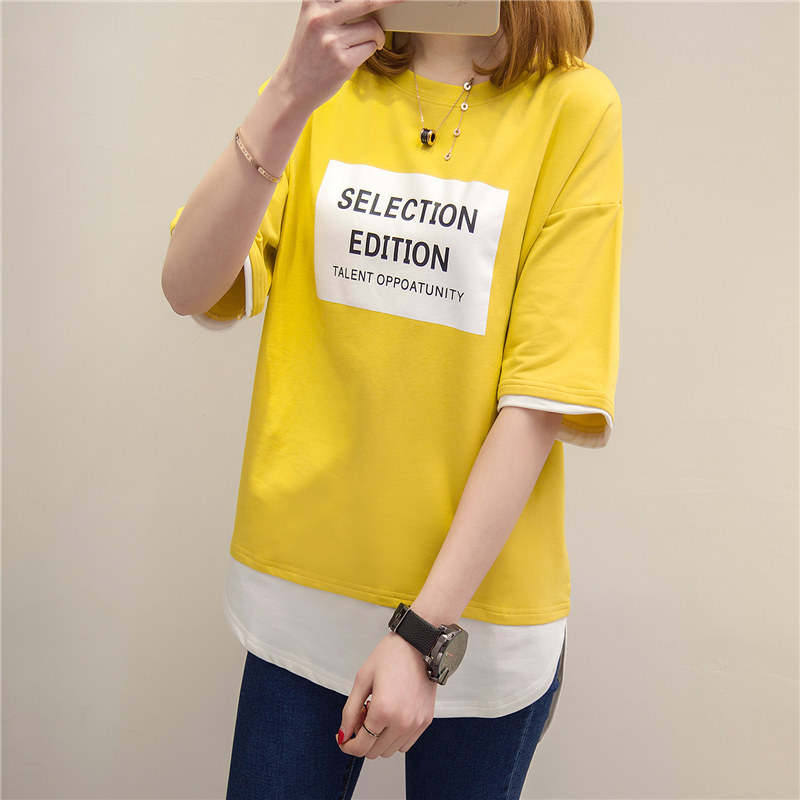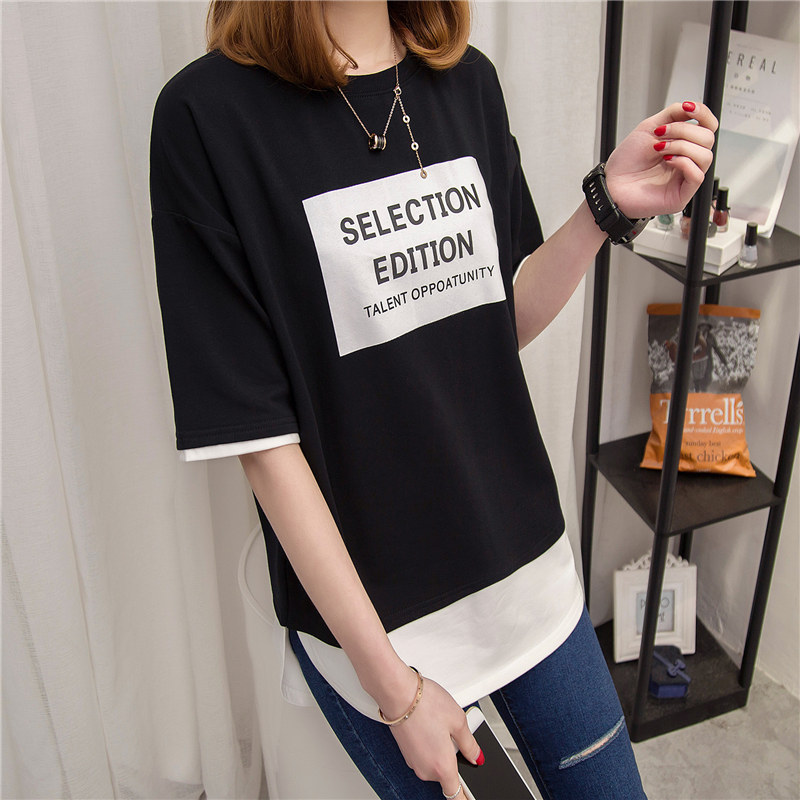 短袖t恤女上衣寬松韓版體恤假兩件中長款體恤夏裝新款女衣服