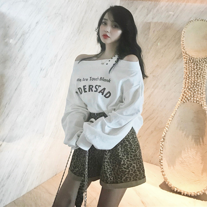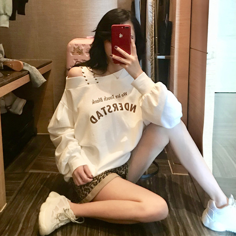 個性柳釘露肩衛衣秋裝女2018新款韓版寬松慵懶風字母長袖上衣外套
