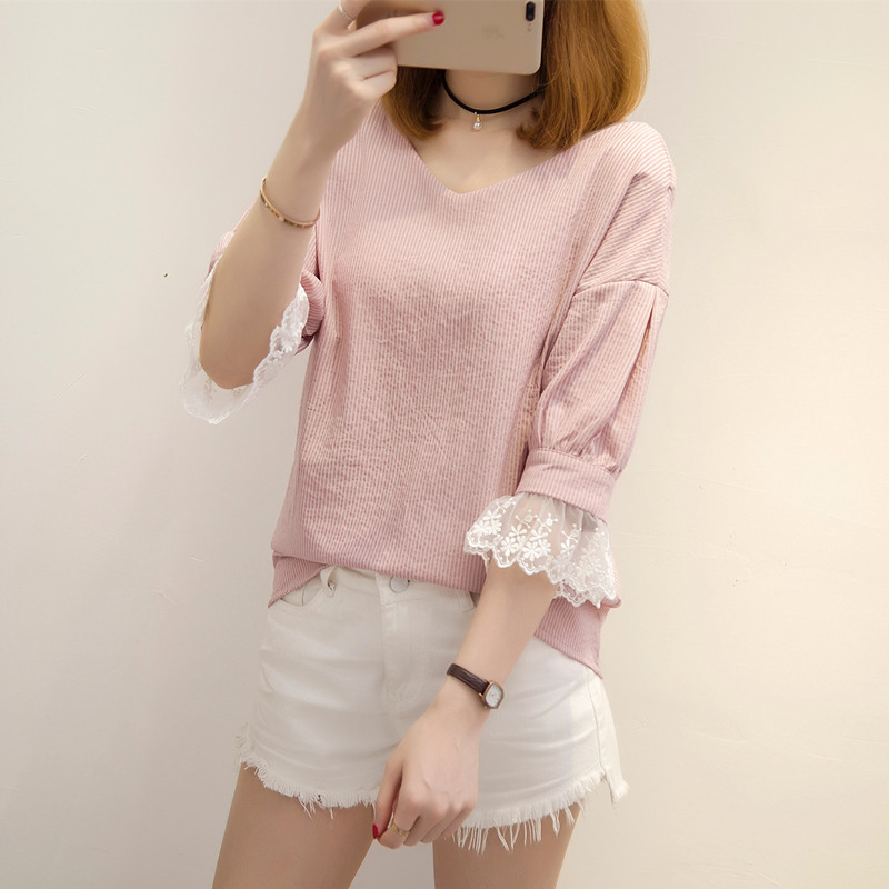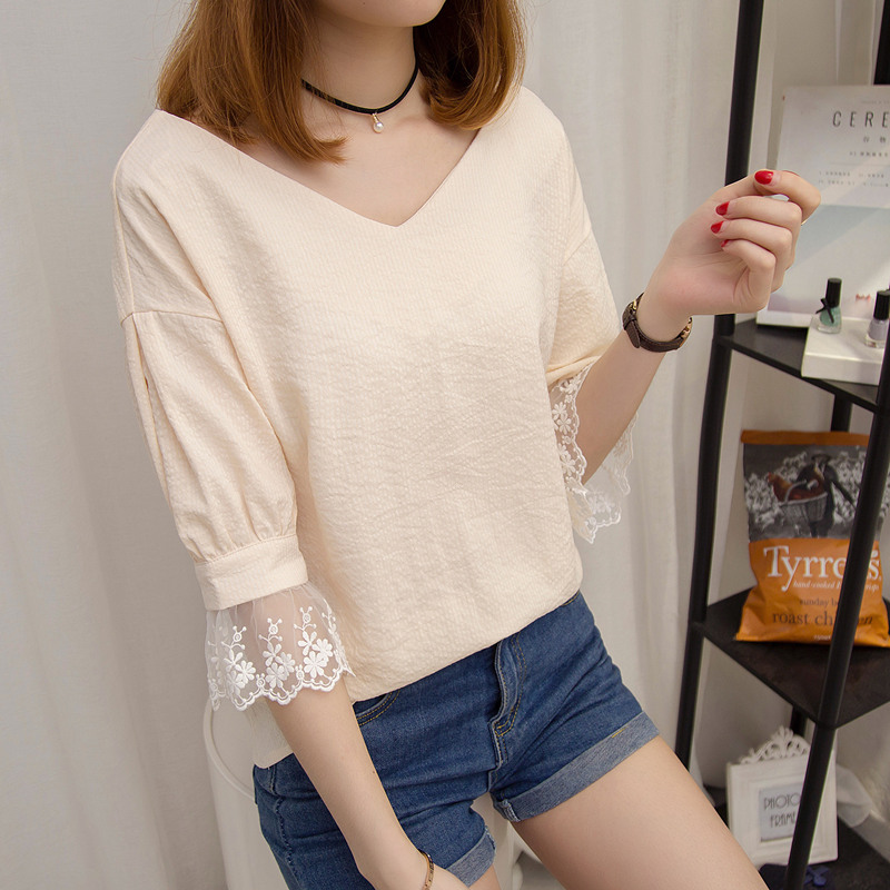 / 夏裝新款女裝V領t恤女bf風韓版蕾絲半袖寬松小清新甜美上衣女
