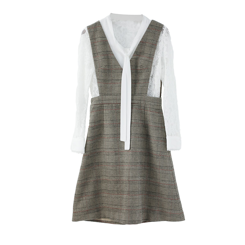 名媛2018秋冬季背帶連衣裙兩件套高腰格子套裝裙長袖蕾絲襯衫女