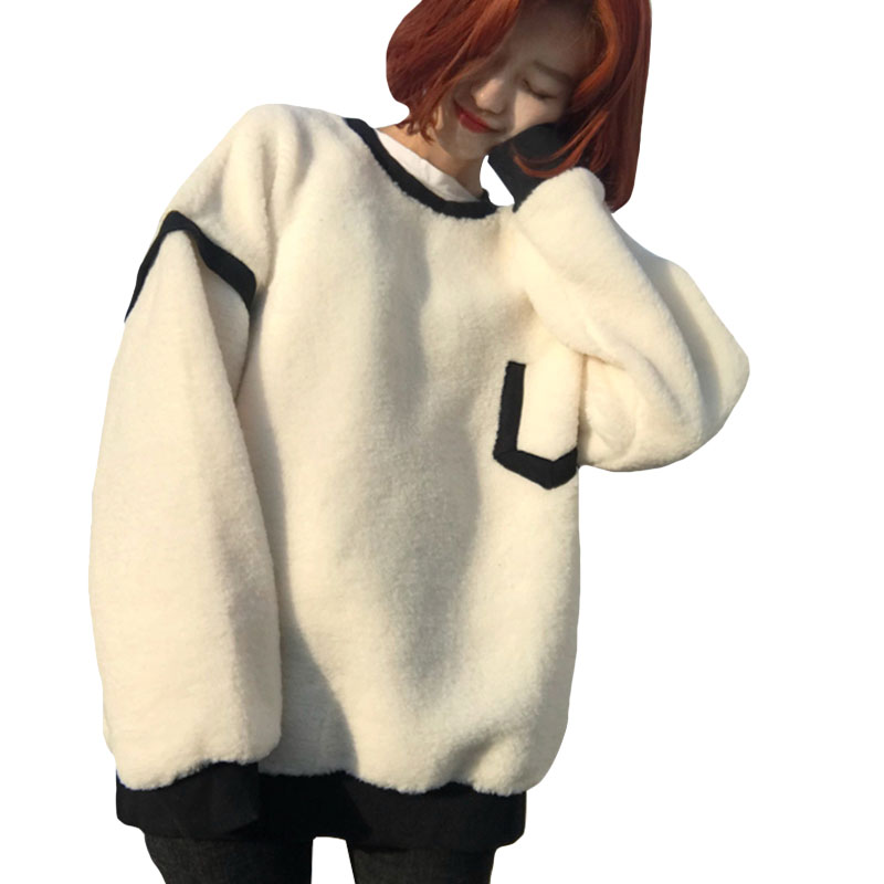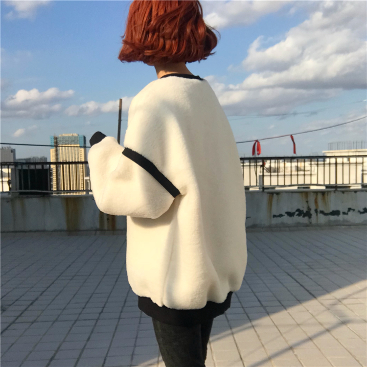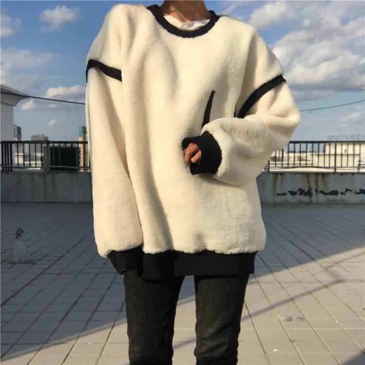 / 秋冬女裝韓版BF風寬松加厚仿羊羔毛螺紋拼接套頭超火衛衣上衣外套