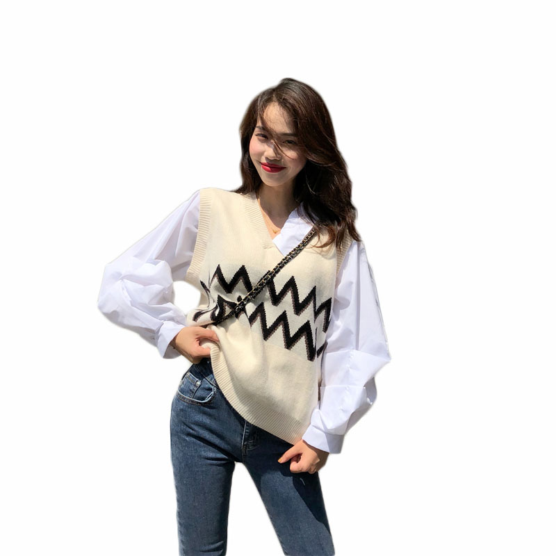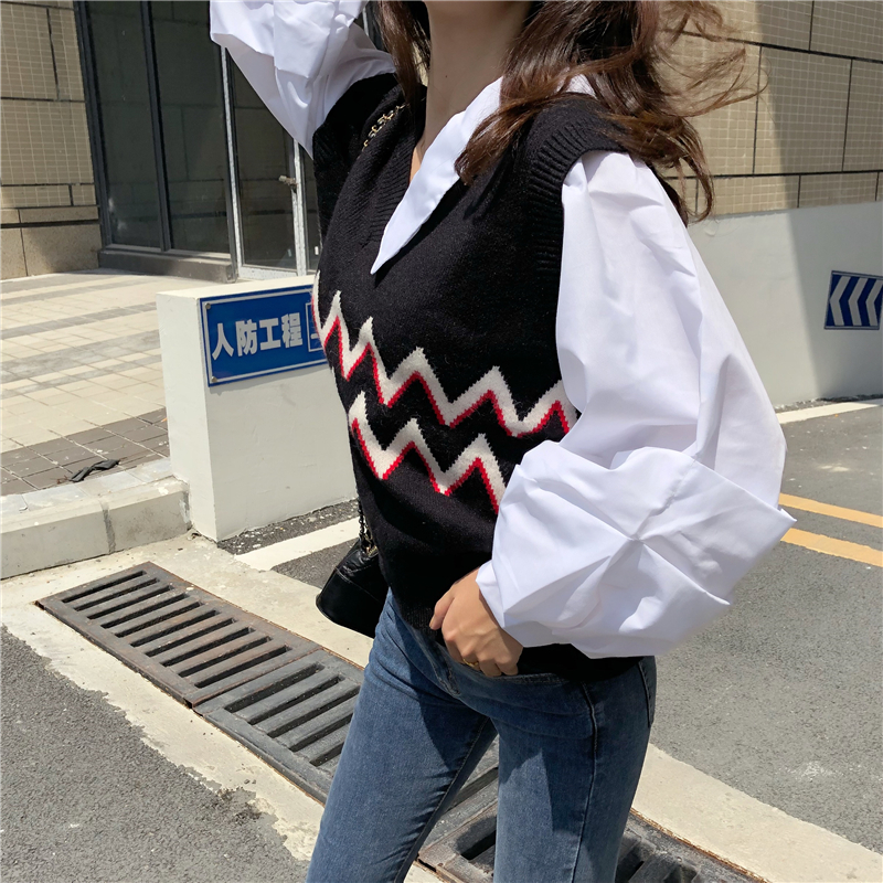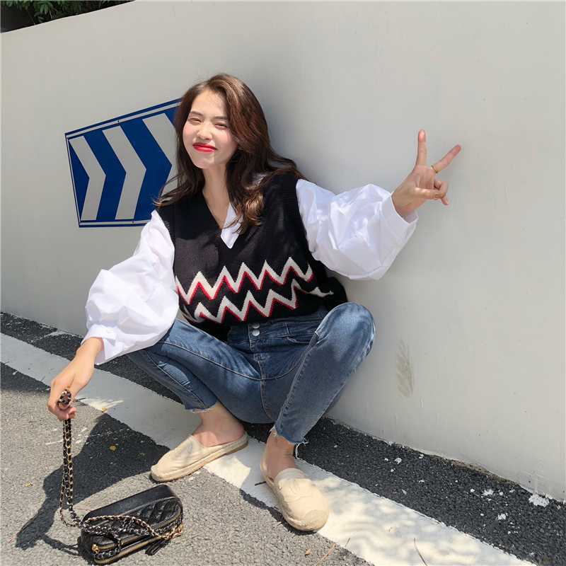 主身是毛線背心的款式,袖身的部分拼接襯衫料