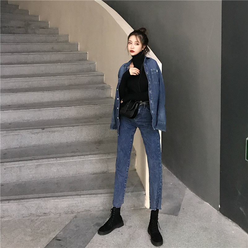 / 港味復古chic風褲子女秋冬2018新款高腰時尚百搭顯瘦直筒牛仔褲女