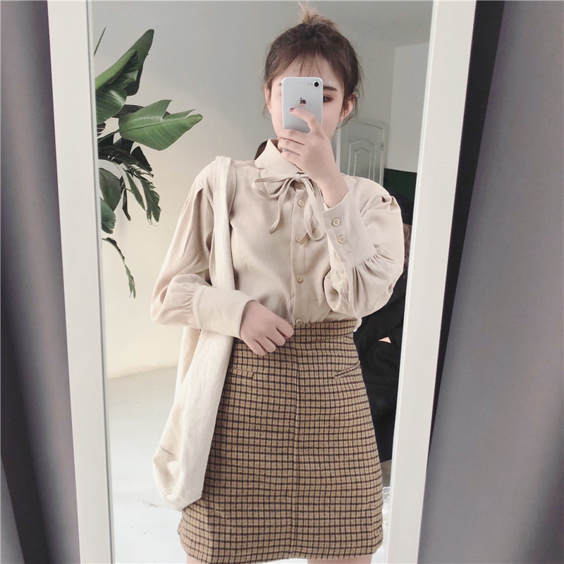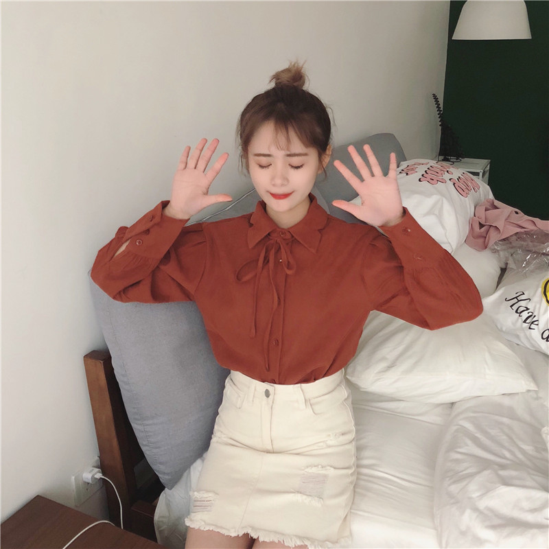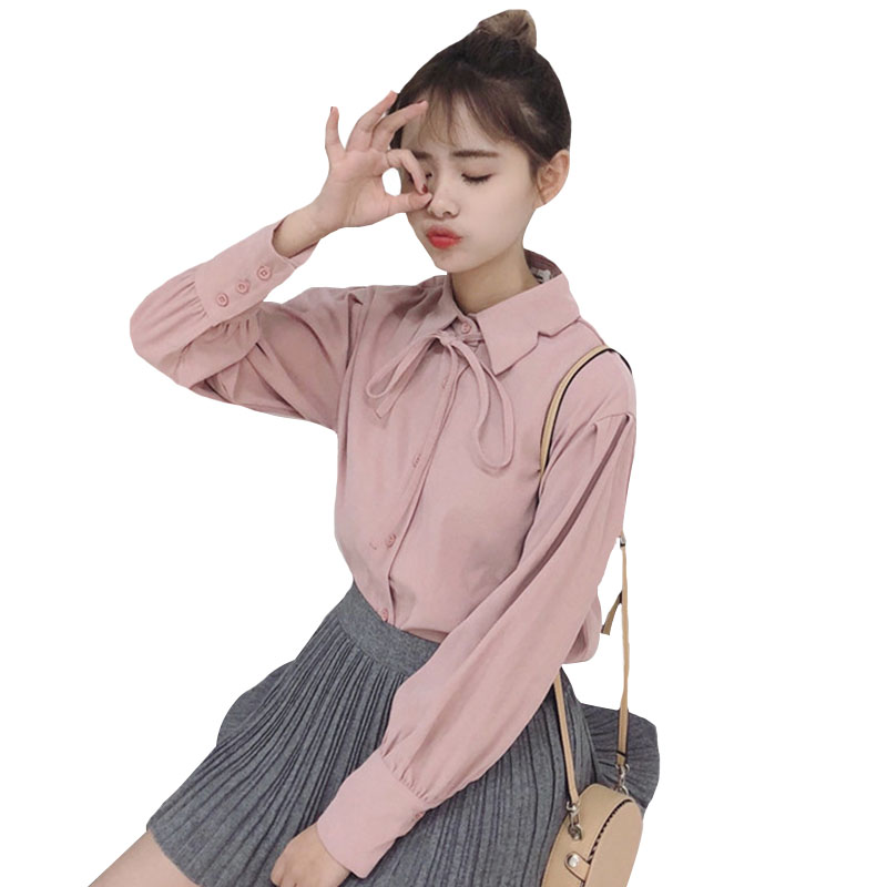 / 秋裝女裝韓版甜美學院風領口不規則系帶長袖襯衣學生休閑襯衫上衣