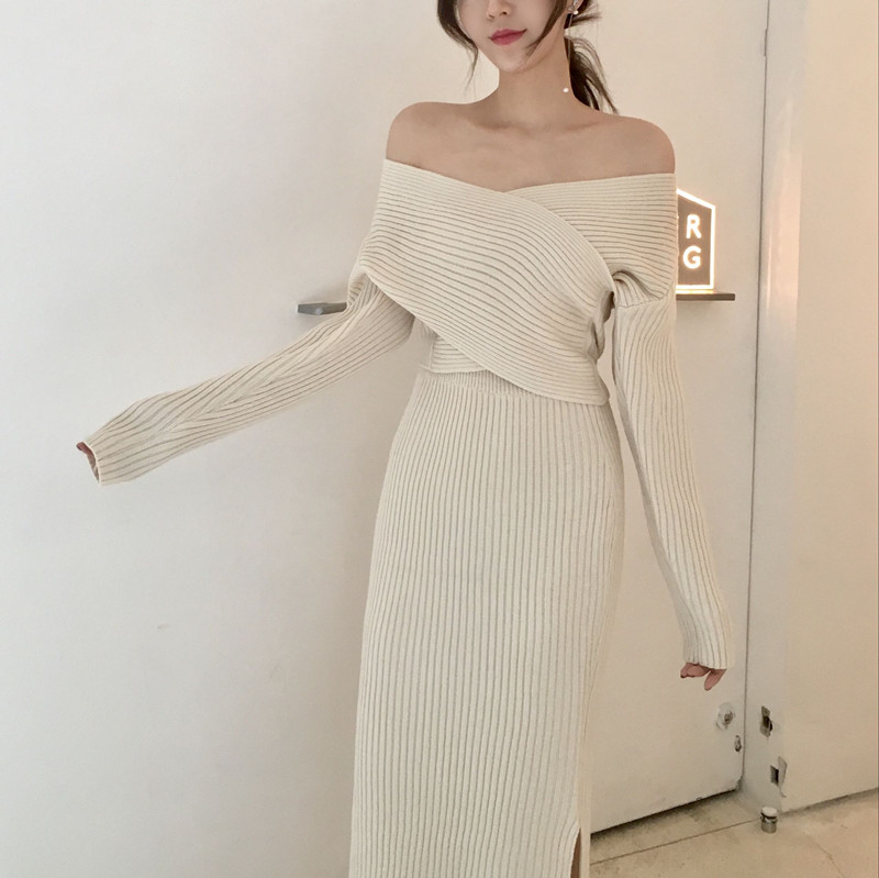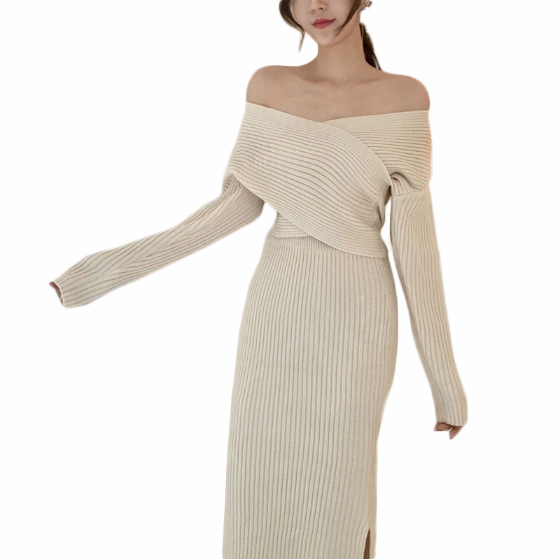 韓版網紅毛衣女慵懶風修身顯瘦打底針織連衣裙長袖V領毛衣長裙潮