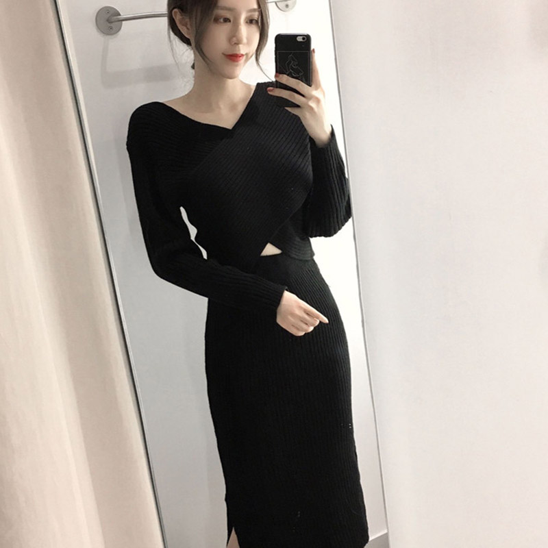 / 氣質V領毛衣時尚交叉高腰半身短裙A字裙+顯瘦針織毛衣套裝兩件套