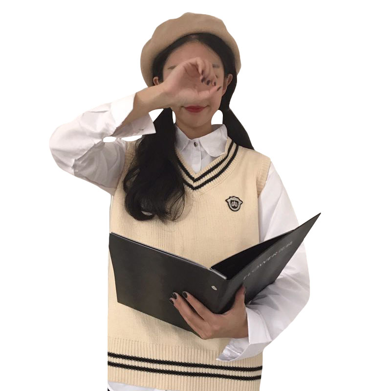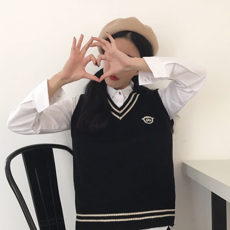 / 秋季女裝韓版學院風減齡徽章V領針織衫上衣寬松無袖馬甲背心外套