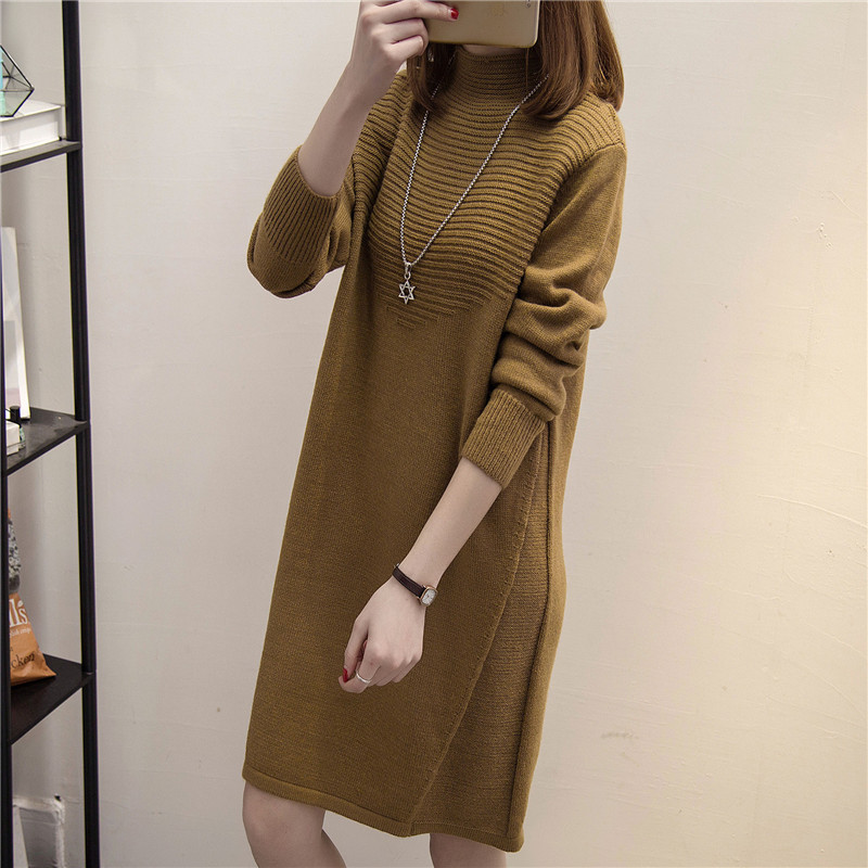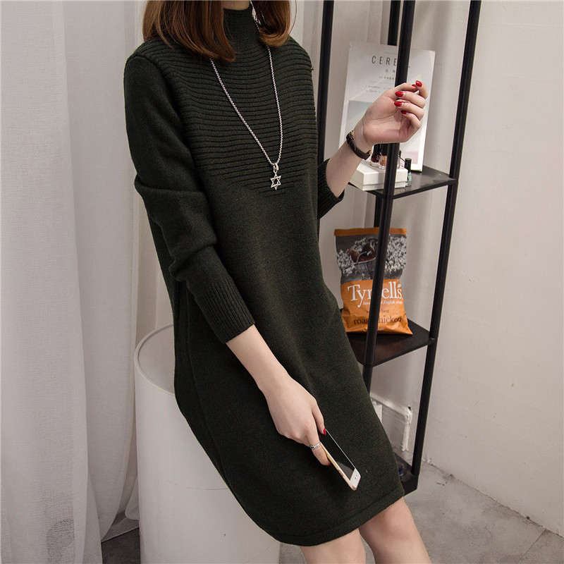 女裝冬裝新款潮韓版上衣寬松套頭女針織衫半高領中長款毛衣裙
