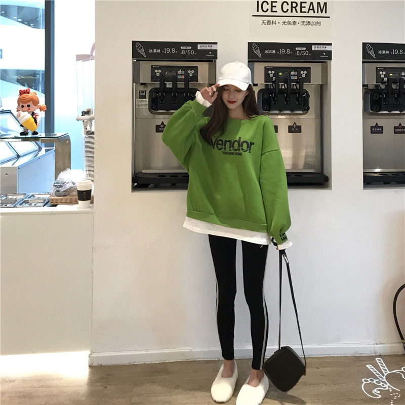 新款韓版寬松bf慵懶風假兩件加絨衛衣側邊緊身顯瘦打底褲時尚套裝