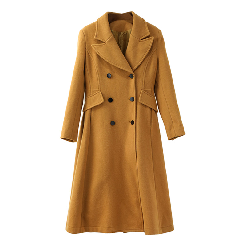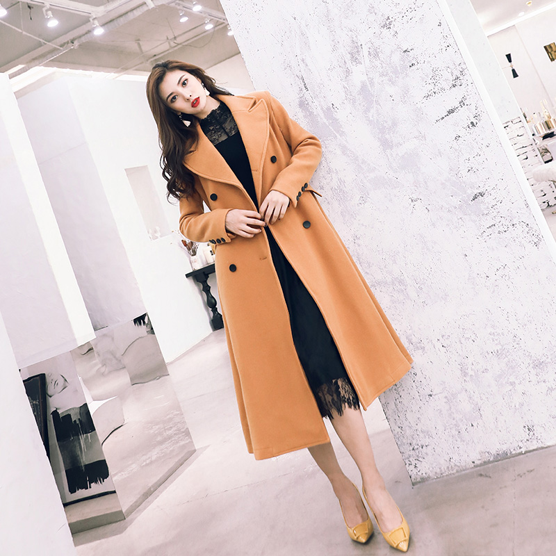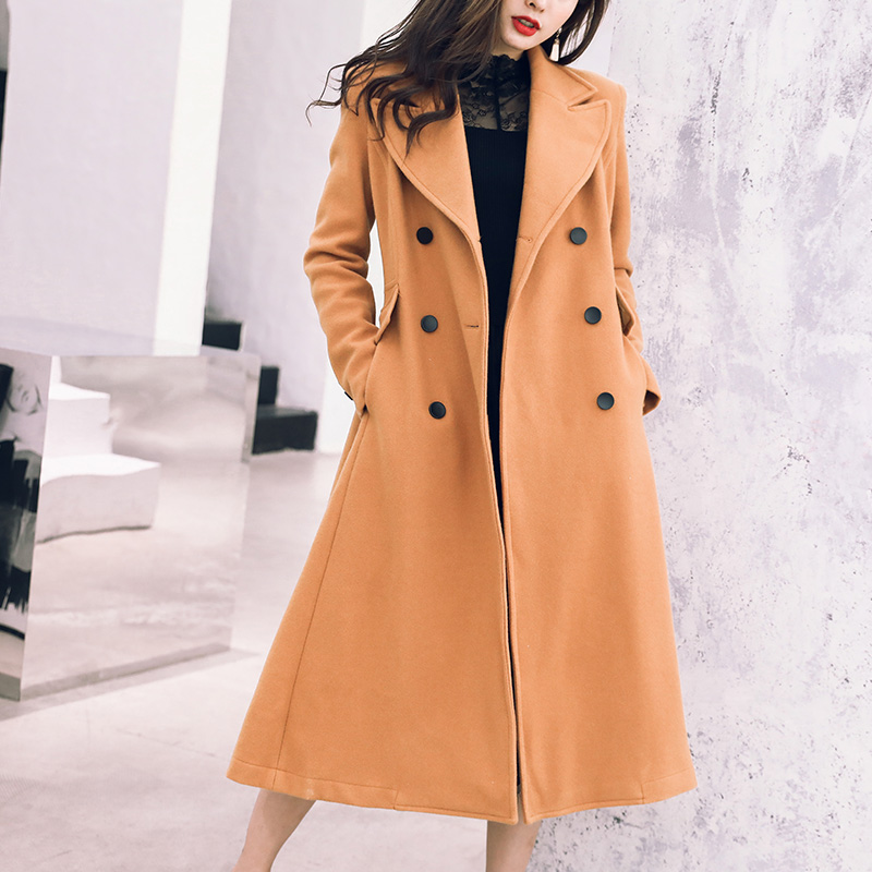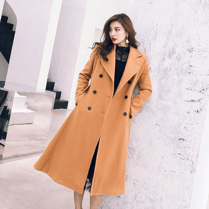 / 名媛氣質2018秋冬韓版風衣毛呢外套雙排扣中長款駝色收腰翻領大衣