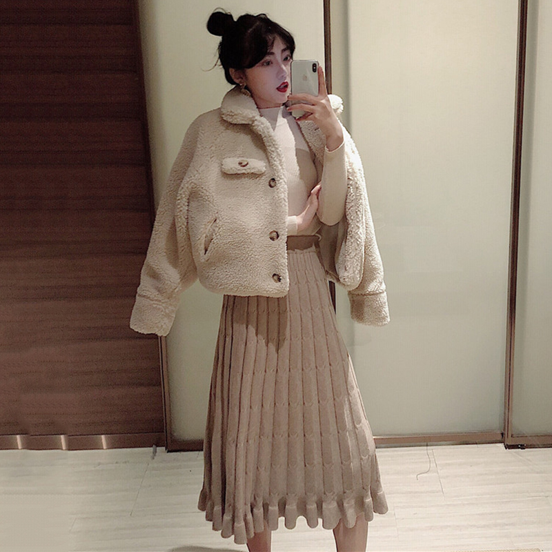 / 御姐套裝女秋冬新款羊羔毛外套修身針織打底衫高腰顯瘦百褶半身裙