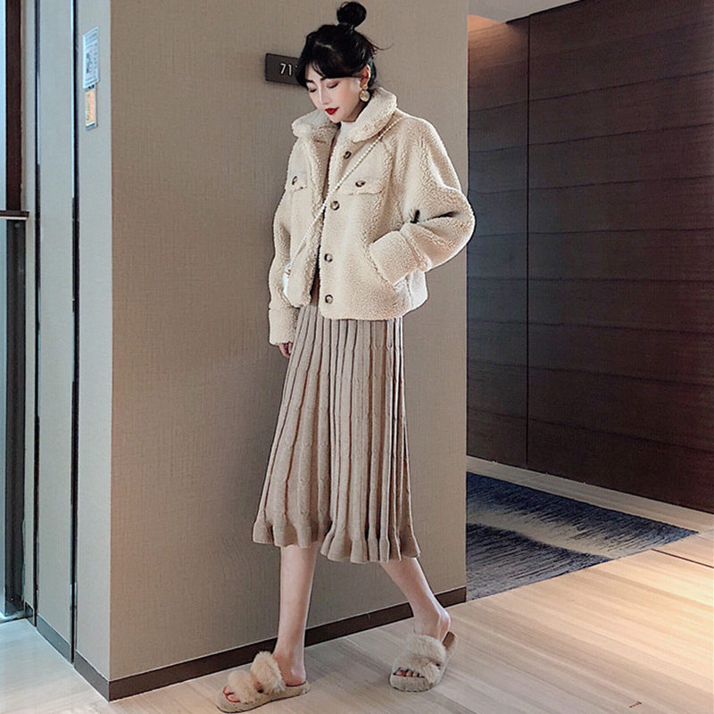 御姐套裝女秋冬新款羊羔毛外套修身針織打底衫高腰顯瘦百褶半身裙