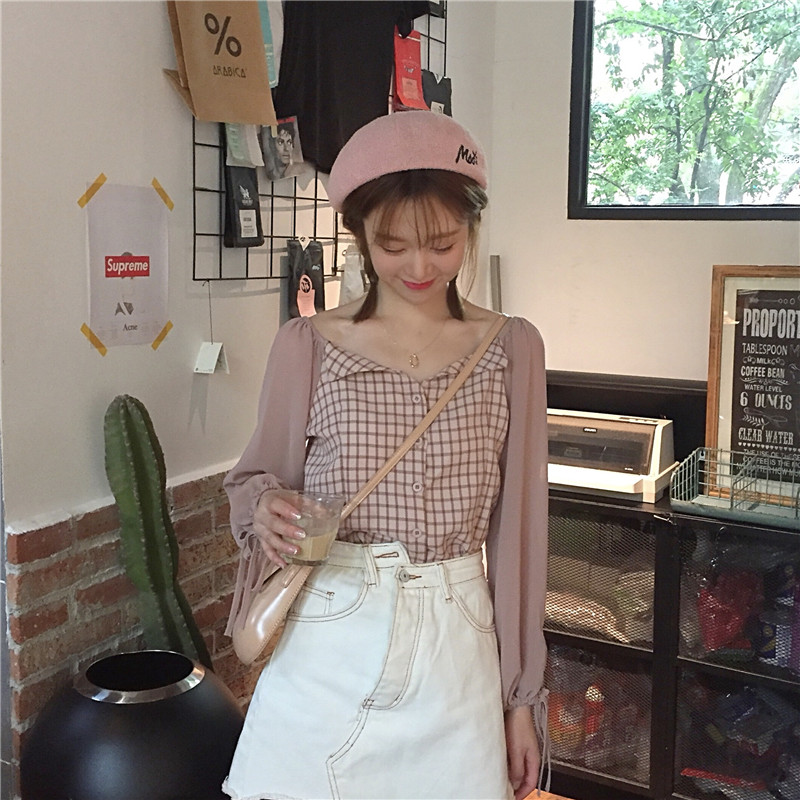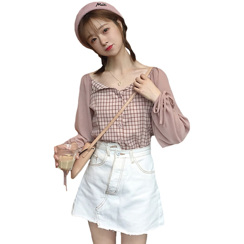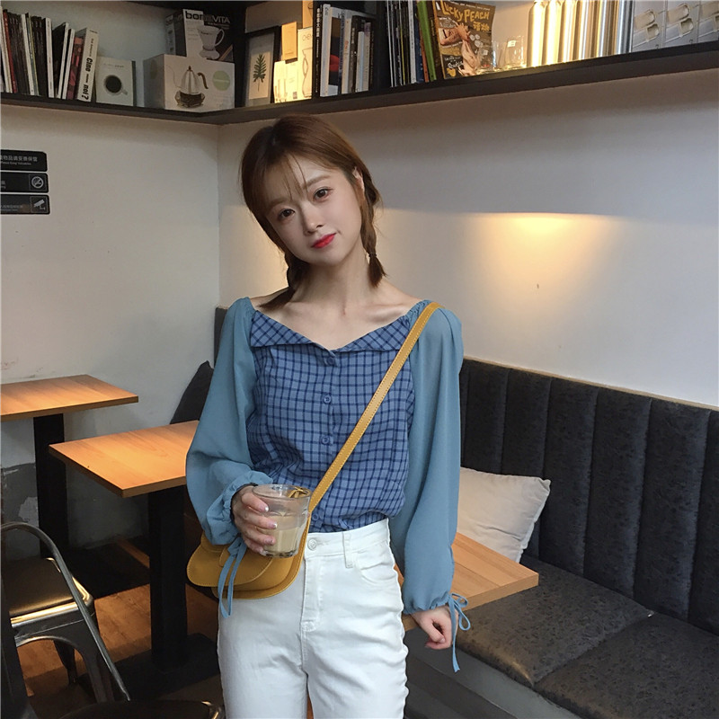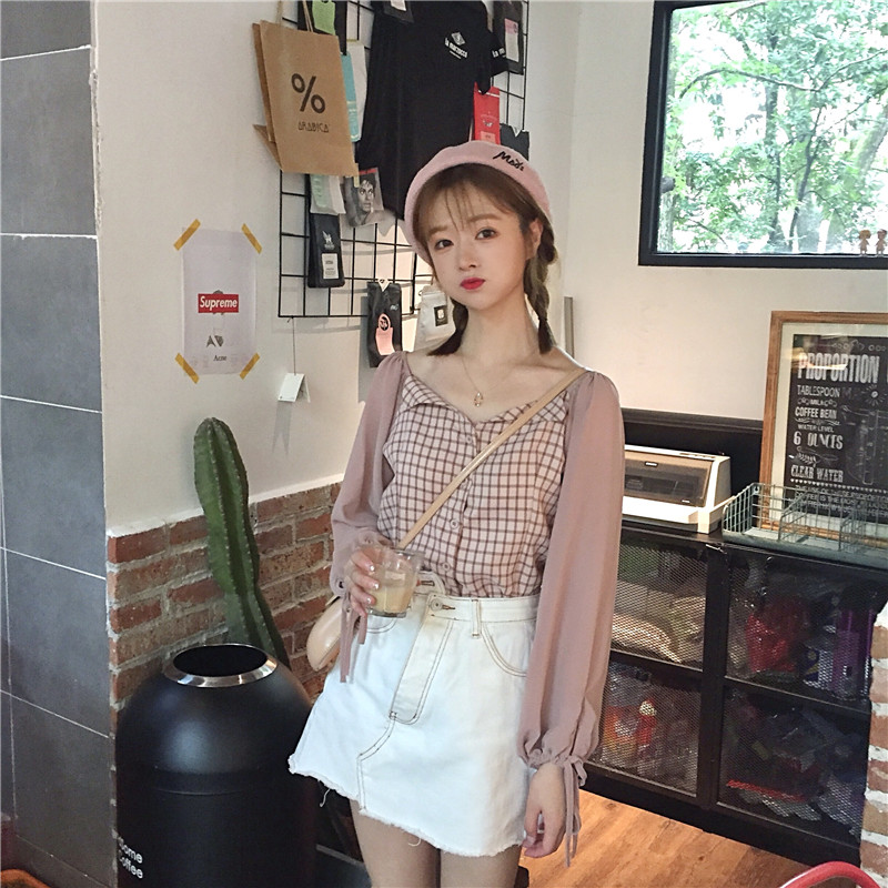 / 秋季韓版修身顯瘦格子拼接系帶燈籠袖襯衣學生長袖休閑襯衫上衣女