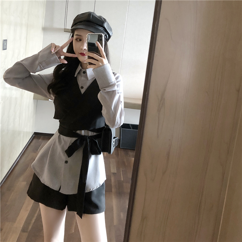 2018秋裝新款韓版百搭小香風長袖襯衫短款綁帶馬甲休閑短褲套裝女