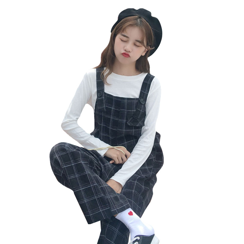 / 秋冬女裝韓版學院風格子背帶褲寬松高腰九分褲直筒褲闊腿褲休閑褲