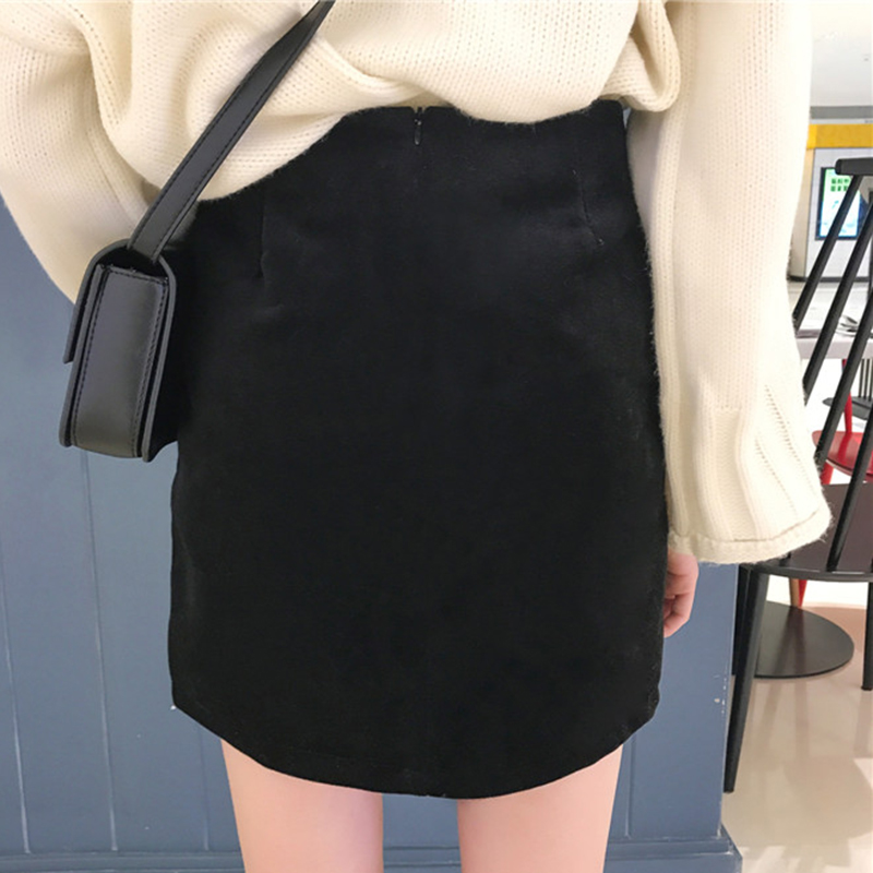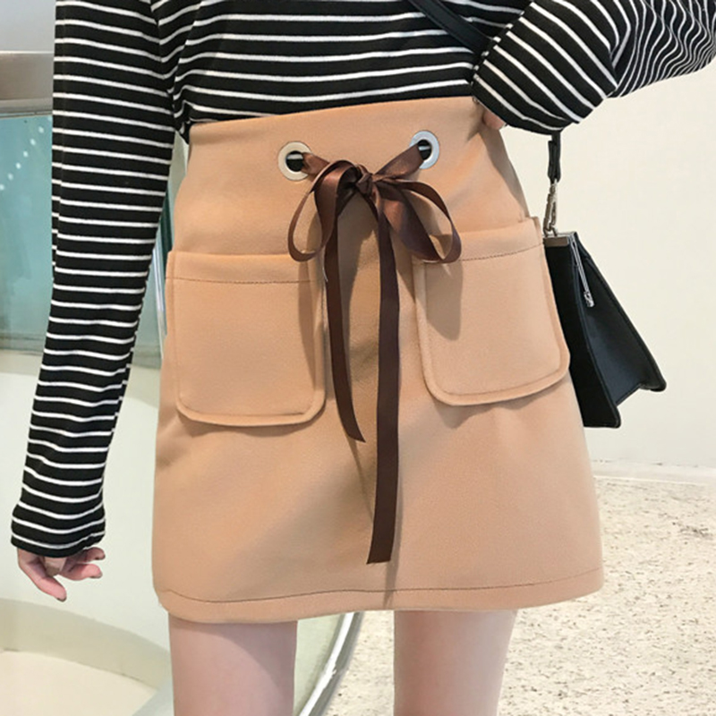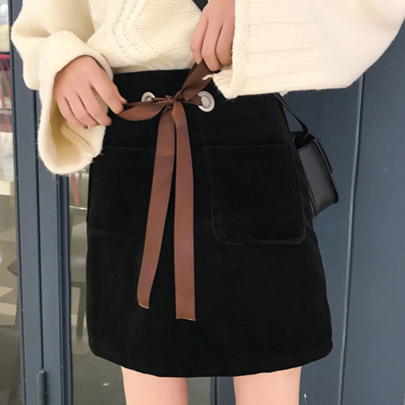 / 復古系帶高腰顯瘦半身裙子女秋冬裝新款韓版學生黑色毛呢A字短裙