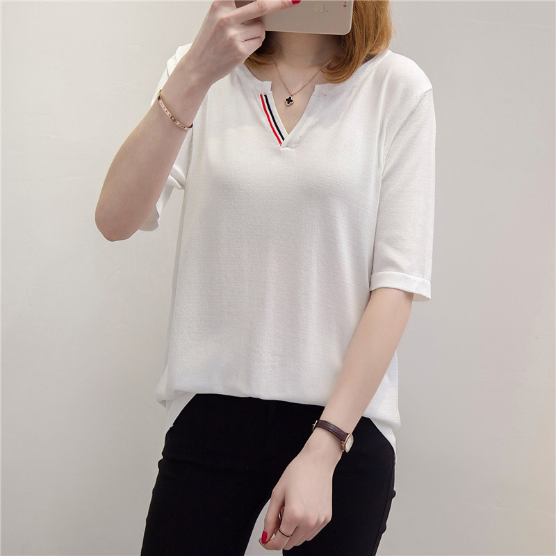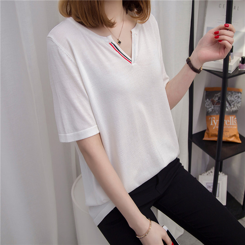 / 短袖上衣女夏新款V領白色針織衫女空調衫寬松韓版百搭打底