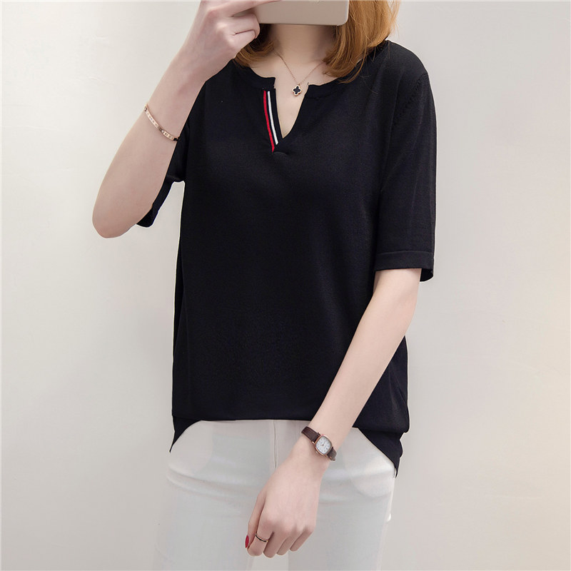 短袖上衣女夏新款V領白色針織衫女空調衫寬松韓版百搭打底