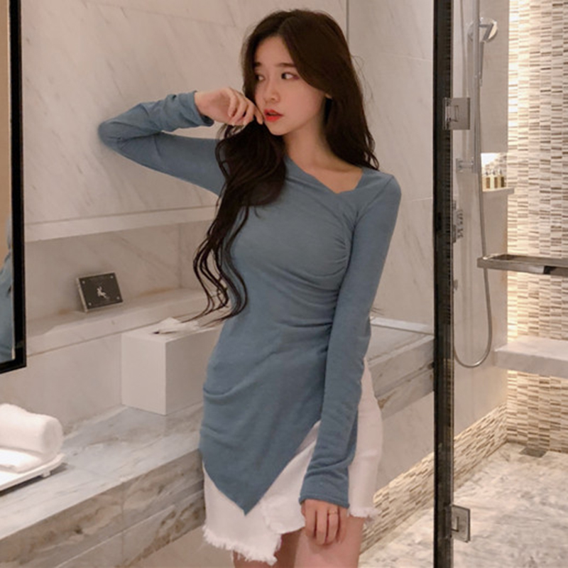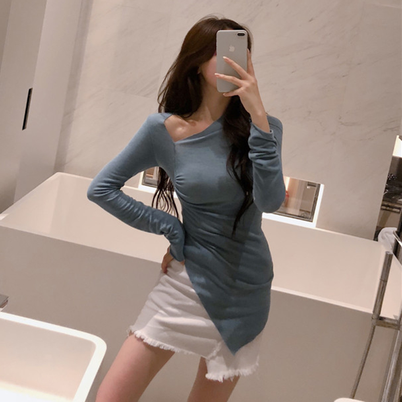 港味修身打底針織衫女秋裝新款斜領純色長袖上衣不規則中長款T恤