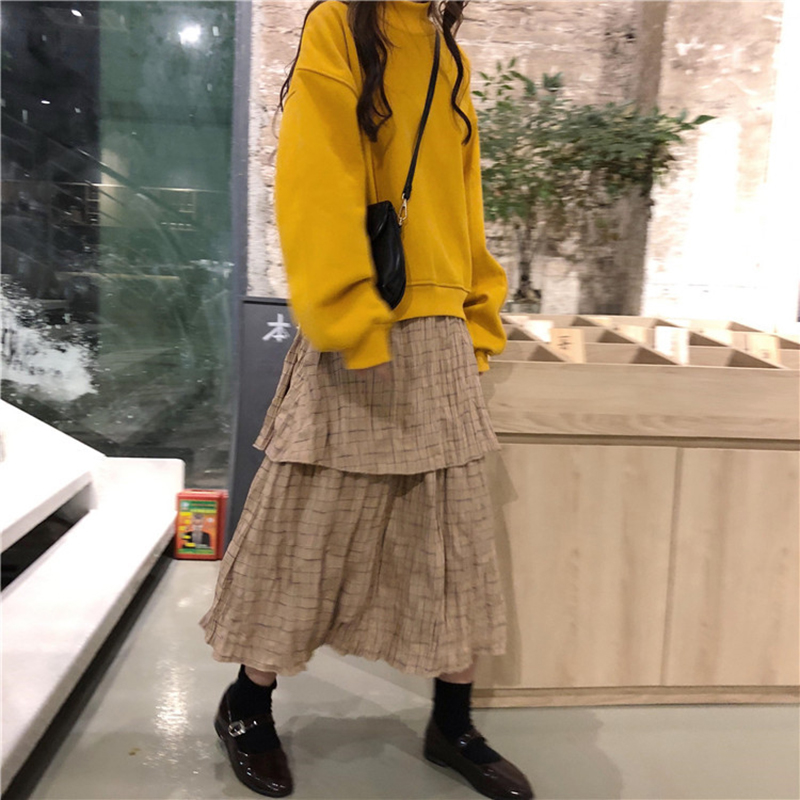 / 套裝女秋冬2018新款半高領衛衣慵懶風黑色外套高腰格子A字半身裙