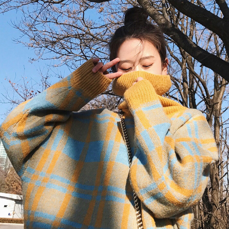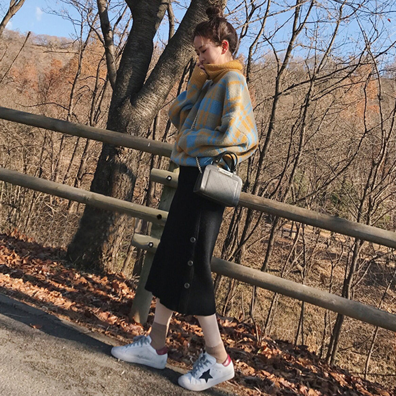 1339藍色格子毛衣黑色裙子
