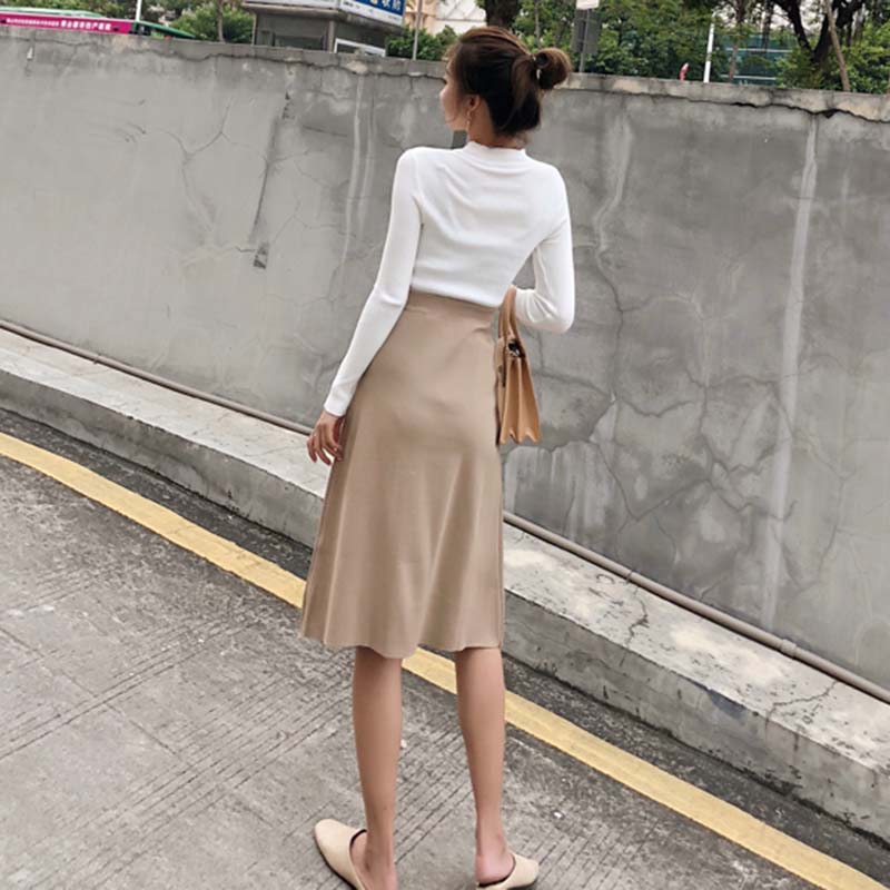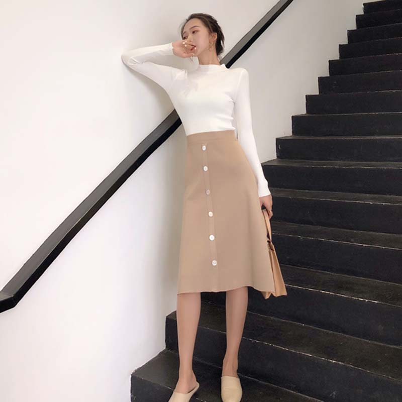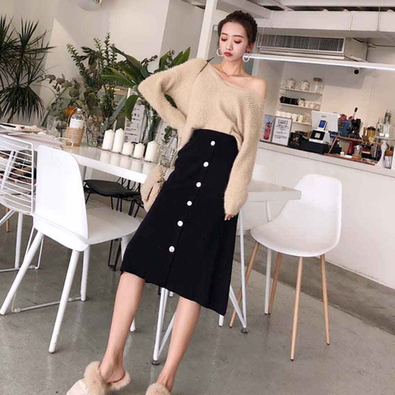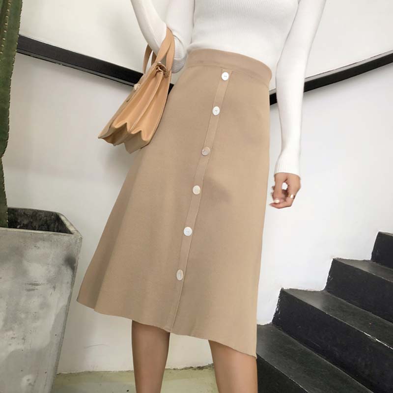 高腰顯瘦A字裙秋裝女2018新款韓版復古單排扣針織裙寬松半身裙子