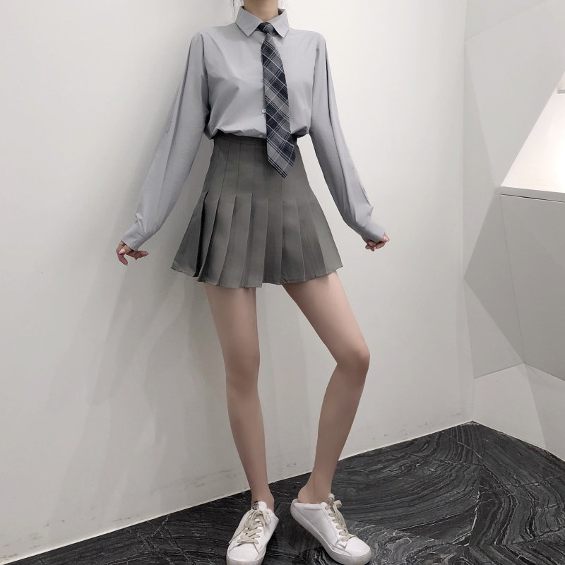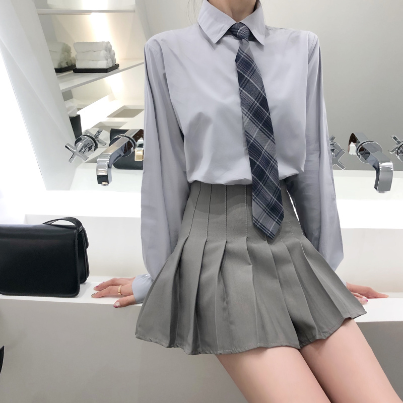 / 韓國秋裝學院風寬松長袖襯衫格紋領帶百褶高腰半身裙時尚套裝女潮