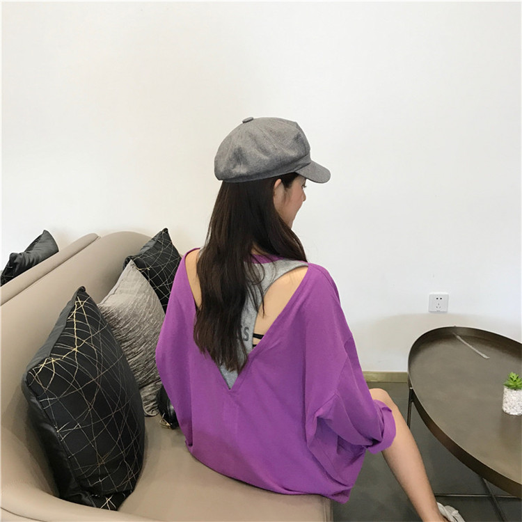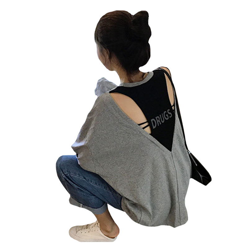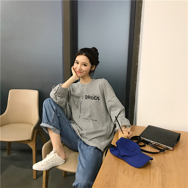 / 秋季女裝韓版中長款原宿風寬松百搭露背字母長袖T恤顯瘦上衣學生