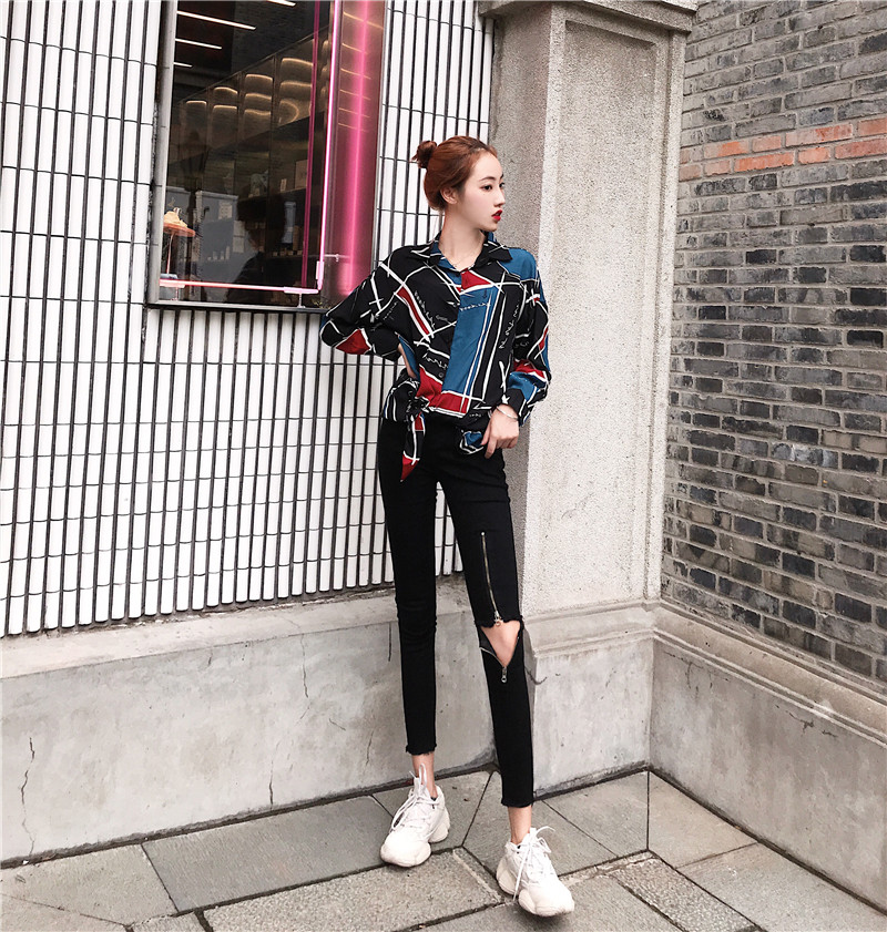 褲子女2018新款個性拉鏈膝蓋破洞時尚牛仔高腰緊身彈力九分小腳褲