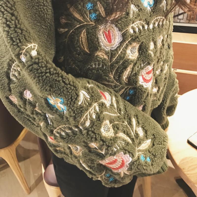 冬款韓國復古chic重工復古花朵刺繡保暖羊羔毛長袖套頭衛衣女