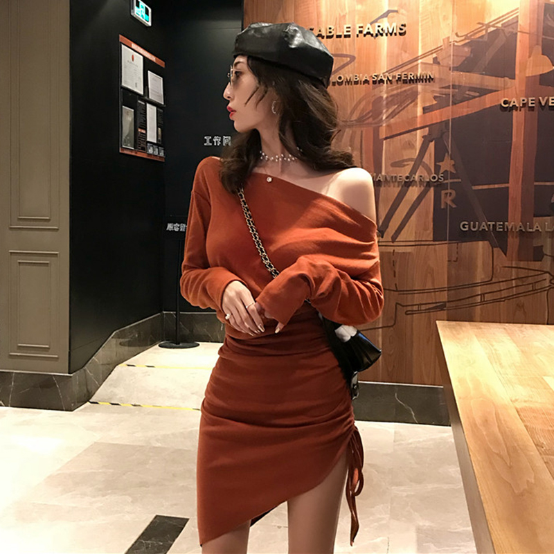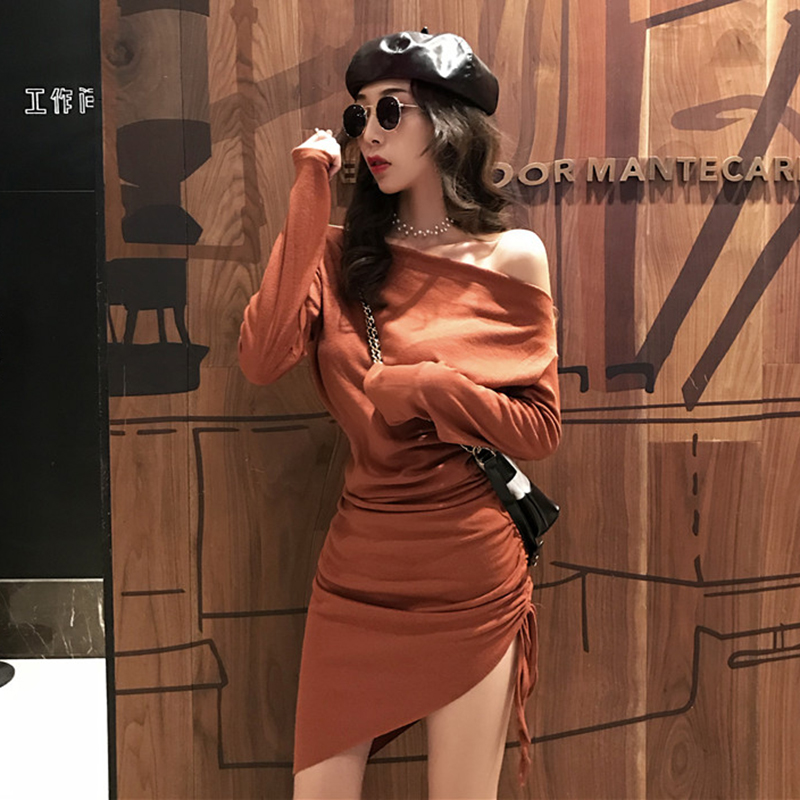 / 不規則包臀裙女秋裝新款氣質露肩長袖連衣裙子抽繩修身顯瘦小黑裙