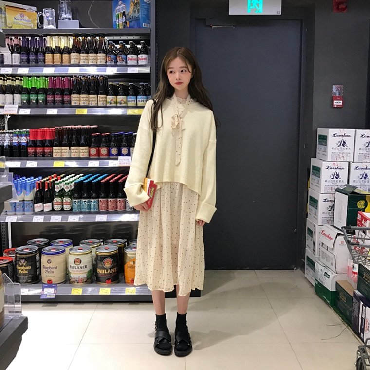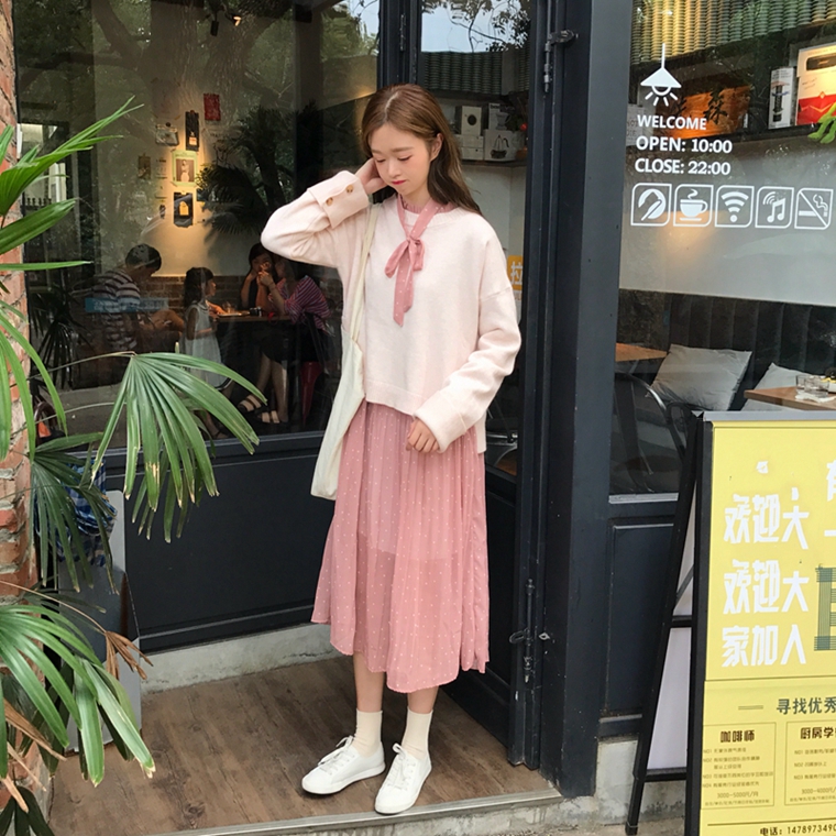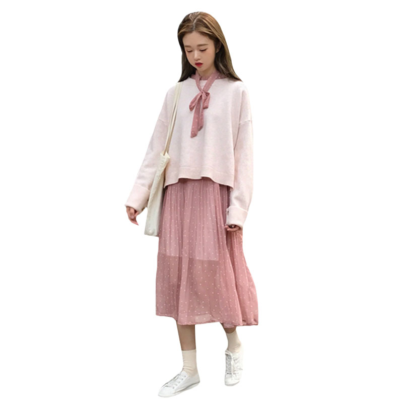 / 韓版時尚休閑套裝秋季針織毛衣+女神波點雪紡百褶連衣裙兩件套女