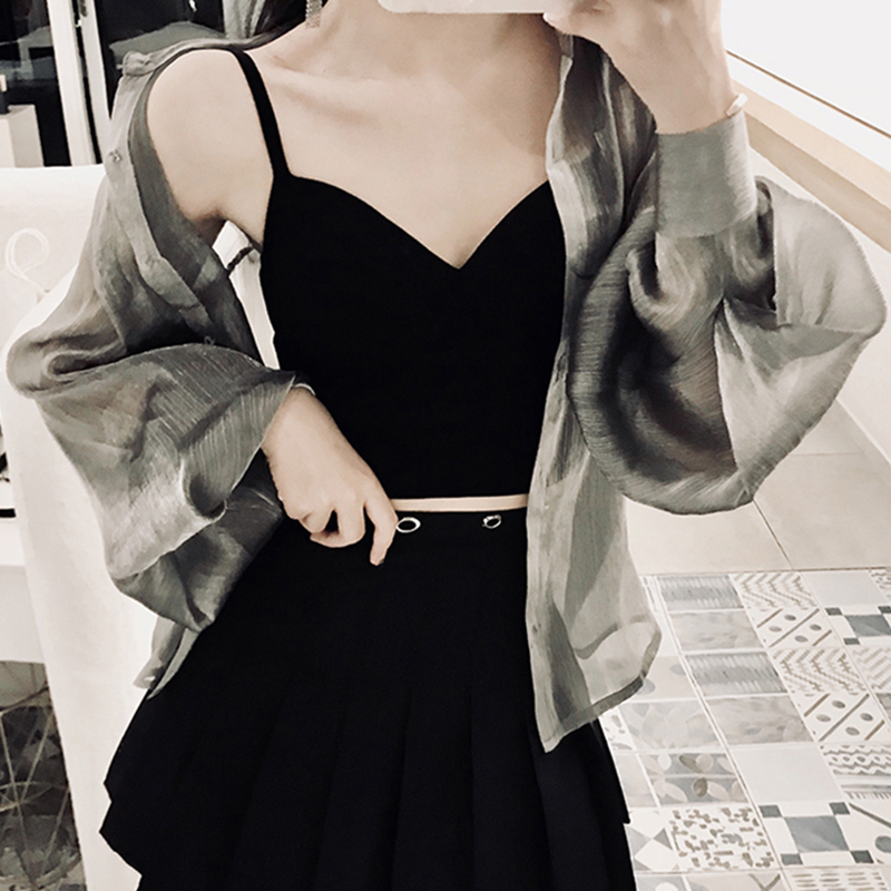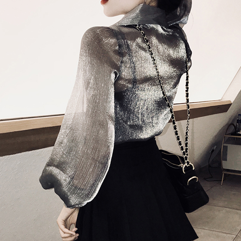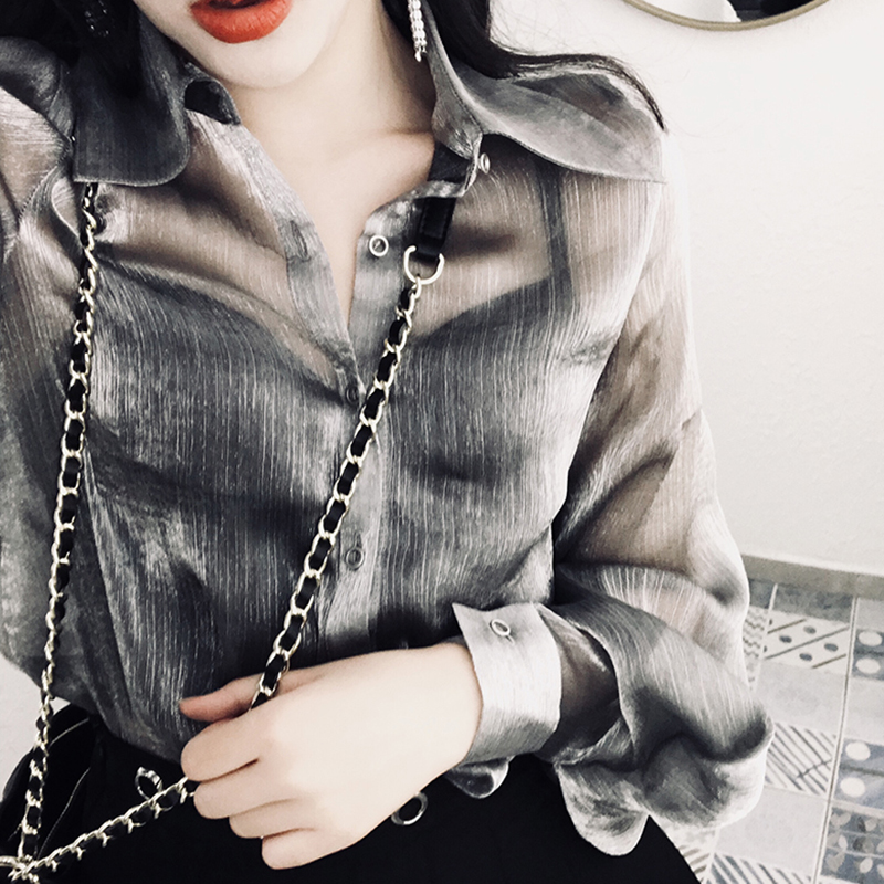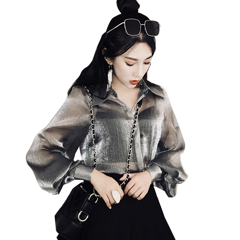 / 襯衣女早秋新款女裝韓版透視燈籠袖防曬襯衫學生銀灰色中長款開衫